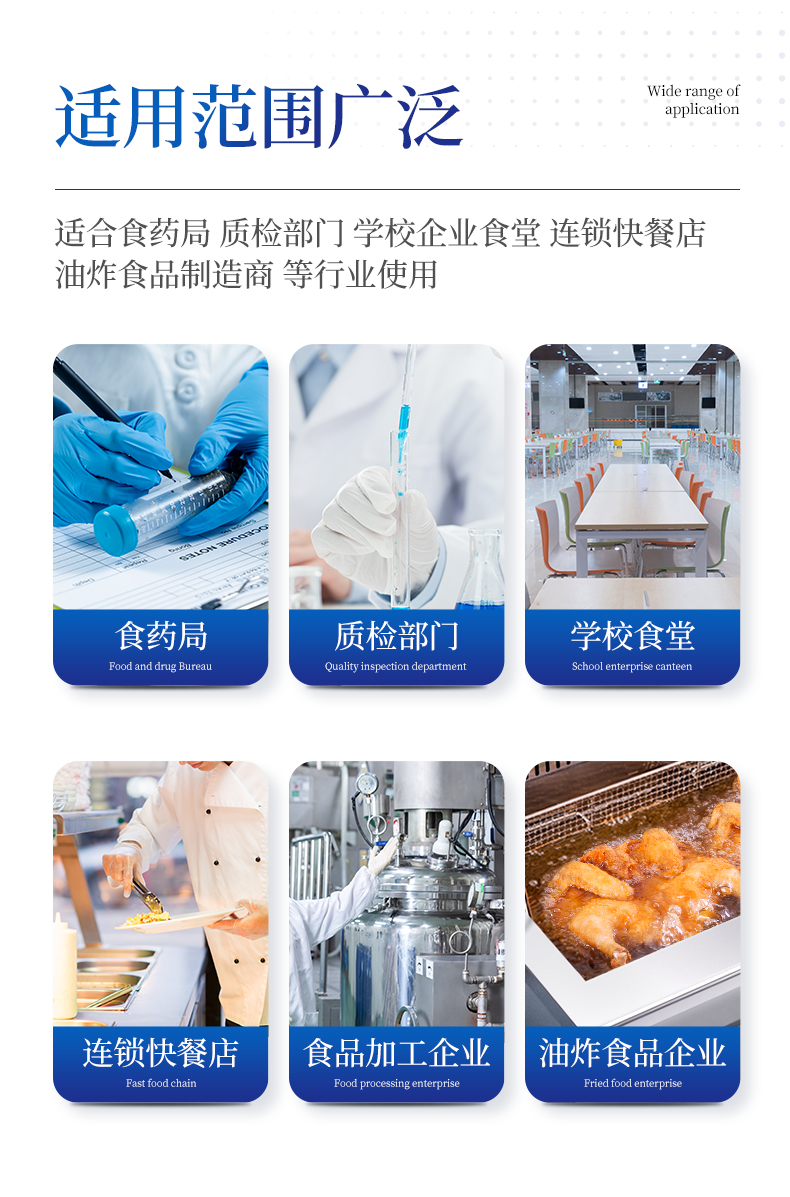 廣泛應(yīng)用于質(zhì)量監(jiān)督檢驗(yàn)、工商管理、油炸食品生產(chǎn)基地、食藥監(jiān)局、衛(wèi)生部門(mén)、肉制品食品深加工企業(yè)、商場(chǎng)超市、各大食品安全監(jiān)測(cè)系統(tǒng)等單位使用。