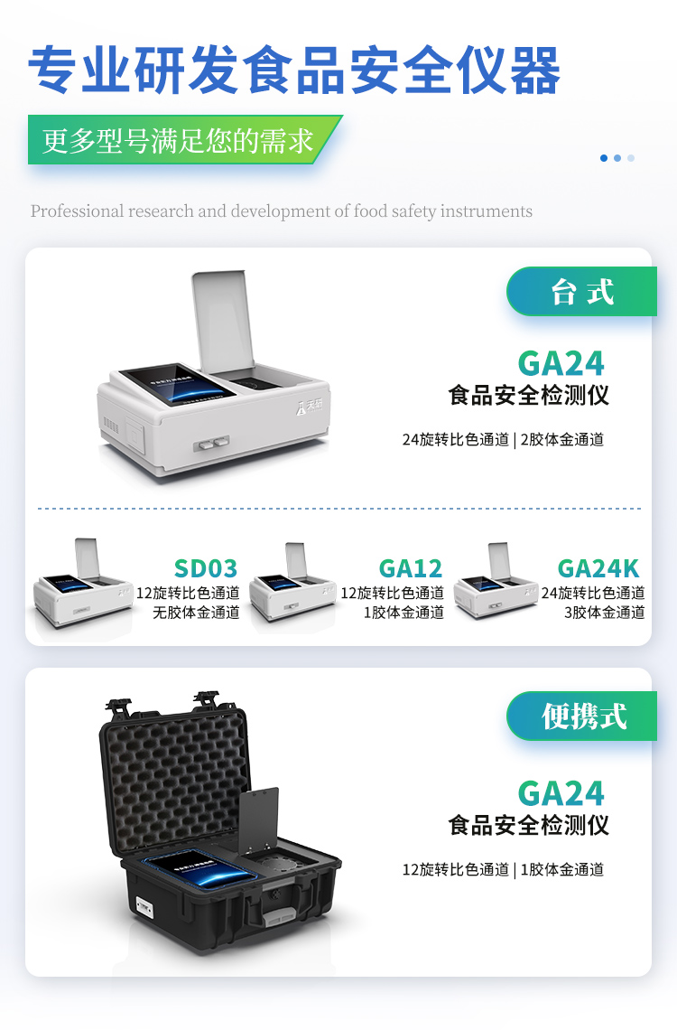 | 食品添加劑:二氧化硫、雙氧水、亞硝酸鹽、硝酸鹽、苯甲酸鈉、山梨酸鉀、糖精鈉、甜蜜素、木耳硫酸鎂等 | 有毒有害物質(zhì):甲醛、吊白塊、硼砂、過(guò)氧化苯甲酰、溴酸鉀、羅丹明B、三聚氰胺、蘇丹紅、工業(yè)堿、尿素、明礬等 | 食用油脂:過(guò)氧化值、酸價(jià)等 | 果蔬:農(nóng)藥殘留(酶抑制率法) | 病害肉:組胺、揮發(fā)性鹽基氮 | 重金屬含量: 鉛、鎘、鉻、汞、砷、錫、鎳、鋁等 | 瘦肉精激素:鹽酸克倫特羅、沙丁胺醇、萊克多巴胺、己烯雌酚等 | 抗生素殘留:四環(huán)素類、硝基呋喃類、磺胺類、β-興奮劑類、沙星類、磺胺類、喹諾酮類,甲砜霉素,氟苯尼考,金剛烷胺、替米考星、慶大霉素、林可霉素、鏈霉素、恩諾沙星、環(huán)丙沙星、頭孢啦啶、青霉素、阿莫西林等 | 水產(chǎn)品安全類:孔雀石綠、氯霉素、呋喃妥因、呋喃西林、呋喃它酮、呋喃唑酮等 | 蛋類藥物殘留:氯霉素,四環(huán)素,磺胺類,喹諾酮類,呋喃西林,呋喃它酮,呋喃妥因,呋喃唑酮,氟苯尼考,阿莫西林、頭孢氨芐、紅霉素、鏈霉素等 | 真菌毒素殘留:食用油、糧食及飼料中黃曲霉毒素B1、黃曲霉毒素總量,奶中黃曲霉毒素M1、嘔吐毒素、玉米赤霉烯酮、赭曲霉毒素A、T2毒素、伏馬毒素等 | 水酒飲品分析:酒中甲醇、乙醇、乳品及牛奶中蛋白質(zhì), | 蜂蜜成分:果糖和葡萄糖、蔗糖、淀粉酶、酸度等 | 調(diào)味品成分:食醋的總酸、醬油的總酸、芝麻油純度、谷氨酸鈉、醬油氨基酸態(tài)氮、食鹽中亞鐵氰化鉀、食鹽中碘等 | 食用色素類:紅色色素(胭脂紅、莧菜紅、莧菜紅)、黃色色素(檸檬黃、日落黃)、藍(lán)色色素(亮藍(lán))等 | 動(dòng)物疫病類:禽流感、新城疫、牛羊口蹄疫、牛羊結(jié)核病、牛羊包蟲、牛羊布病、小反芻獸、豬藍(lán)耳病毒、豬瘟病毒、豬偽狂犬病毒、豬細(xì)小、豬圓環(huán)、犬細(xì)小病毒、犬瘟熱病毒、犬狂犬病毒等 |
