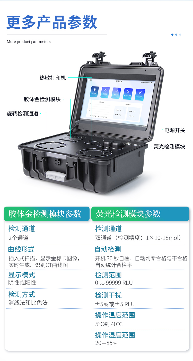 | 儀器采用臺(tái)式一體化系統(tǒng)檢測(cè)技術(shù),將分光光度模塊、膠體金檢測(cè)模塊、新型農(nóng)殘檢測(cè)模塊、數(shù)字化管理模塊、無(wú)線通訊模塊高度集成于一體,支持檢測(cè)200種食品安全檢測(cè)項(xiàng)目,同時(shí)預(yù)留升級(jí)檢測(cè)方法。 | 儀器檢測(cè)模塊標(biāo)準(zhǔn)化、智能化,可隨意自由組合。檢測(cè)箱體內(nèi)置多個(gè)標(biāo)準(zhǔn)檢測(cè)單元,檢測(cè)模塊可以調(diào)整配置。 | 顯示屏幕:儀器采用10.1英寸豎向液晶觸摸屏顯,搭配運(yùn)行安卓智能操作系統(tǒng),主控芯片采用ARM Cortex-A7,RK3288/4核處理器,主頻1.88Ghz,操作方便,性能更強(qiáng)。 | 檢測(cè)通道:≥24通道;采用精密旋轉(zhuǎn)比色池設(shè)計(jì),使用同芯片同光源校準(zhǔn)精度,解決不同光源之間的誤差值,更加準(zhǔn)確**。(1-12通道間誤差0.1%,**號(hào):ZL202022821055.2) | 儀器光源:高精度進(jìn)口四波長(zhǎng)冷光源,每個(gè)通道均配置 410、520、590、630nm 波長(zhǎng)光源,標(biāo)配**的光路切換裝置,**光路切換功能可實(shí)現(xiàn)64波長(zhǎng),并且所有檢測(cè)項(xiàng)目可實(shí)現(xiàn)所有通道同時(shí)檢測(cè)。 | 設(shè)備可一鍵校準(zhǔn),自動(dòng)保存校準(zhǔn)數(shù)據(jù),自動(dòng)對(duì)比校驗(yàn),得到精準(zhǔn)光源,采用Android SP存儲(chǔ)數(shù)據(jù),光源數(shù)據(jù)永不丟失,方便每一次使用。 | 通訊接口:配備無(wú)線通信模塊、可選配4G(APN)通訊模塊和藍(lán)牙傳輸,同時(shí)具有雙USB接口以及RJ45網(wǎng)線接口,可以多方式實(shí)現(xiàn)數(shù)據(jù)保存及數(shù)據(jù)傳輸。 | 存儲(chǔ)方式:支持U盤存儲(chǔ),標(biāo)準(zhǔn)USB接口,免驅(qū)動(dòng)安裝。檢測(cè)結(jié)果存儲(chǔ)容量20萬(wàn)條以上,可生成Excel表格進(jìn)行拷貝,并具有登錄保護(hù)功能。 | 智能化操作系統(tǒng): | 1、操作系統(tǒng):儀器可在同一檢測(cè)界面自動(dòng)對(duì)應(yīng)相關(guān)檢測(cè)通道,一次性選擇1-12個(gè)樣品名稱,無(wú)需退出界面,節(jié)省操作時(shí)間。并可以對(duì)每個(gè)通道屬性和樣品信息單獨(dú)進(jìn)行編輯,例如送檢單位、人員,檢測(cè)人員等,打印時(shí)勾選打印顯示。 | 2、數(shù)據(jù)集成系統(tǒng):設(shè)備首頁(yè)自動(dòng)匯總分析檢測(cè)數(shù)據(jù),包含:周檢測(cè)數(shù)據(jù)、月檢測(cè)數(shù)據(jù),總檢測(cè)數(shù)量,均包含檢測(cè)總數(shù),合格數(shù),不合格數(shù),以及相關(guān)柱形分析圖,各項(xiàng)檢測(cè)數(shù)據(jù)一目了然,無(wú)需電腦查詢,更加快捷直觀。 | 3、數(shù)據(jù)庫(kù)系統(tǒng):十幾項(xiàng)數(shù)據(jù)庫(kù)分類管理儀器:包含項(xiàng)目類型、項(xiàng)目數(shù)據(jù)、檢測(cè)數(shù)據(jù)、歷史記錄、國(guó)標(biāo)信息、曲線信息、采樣信息、檢測(cè)信息、受檢信息、復(fù)核信息、圖表信息、光源校準(zhǔn)信息、打印樣式信息、樣品庫(kù)信息等等,數(shù)據(jù)庫(kù)之間互相協(xié)調(diào)聯(lián)動(dòng)保證數(shù)據(jù)的真實(shí)完整性。同時(shí)產(chǎn)品數(shù)據(jù)庫(kù)以及歷史檢測(cè)記錄支持一鍵檢索功能。 | 4、限量規(guī)判系統(tǒng):具有限量查詢、添加物質(zhì)合規(guī)判定系統(tǒng)。檢測(cè)出結(jié)果后,系統(tǒng)自動(dòng)調(diào)用系統(tǒng)數(shù)據(jù)庫(kù)中相關(guān)國(guó)標(biāo)進(jìn)行比對(duì)判定,客觀顯示判定結(jié)果是否合格。 | 5、項(xiàng)目預(yù)設(shè)系統(tǒng):儀器具有任務(wù)預(yù)設(shè)模塊,一鍵提前預(yù)設(shè),給出方便快捷的新檢測(cè)方案,每一個(gè)任務(wù)分別可以設(shè)置不同的樣品、批次、編號(hào)、來(lái)源、備注、抽樣信息、檢測(cè)信息、受檢信息、復(fù)核信息等更多信息。樣品送檢時(shí)一鍵調(diào)取保存信息,并可多次調(diào)取,大大提高檢測(cè)效率。 | 6、數(shù)據(jù)監(jiān)管系統(tǒng):同步對(duì)接監(jiān)管平臺(tái),數(shù)據(jù)可局域網(wǎng)和互聯(lián)網(wǎng)數(shù)據(jù)上傳,檢測(cè)結(jié)果可直接傳至食品安全監(jiān)管平臺(tái)。進(jìn)行區(qū)域食品安全監(jiān)管及大數(shù)據(jù)分析處理與數(shù)據(jù)統(tǒng)計(jì),監(jiān)測(cè)區(qū)域食品安全長(zhǎng)短期動(dòng)態(tài)及問(wèn)題預(yù)估、預(yù)警。 | 7、全新打印系統(tǒng):內(nèi)置全新打印機(jī),新創(chuàng)自定義打印方式,可按需靈活勾選控制:產(chǎn)品合格證(國(guó)家農(nóng)業(yè)部標(biāo)準(zhǔn)要求),二維碼,抽樣信息、檢測(cè)信息,受檢信息、復(fù)核信息、抽樣日期、檢測(cè)日期等信息的打印。 | 8、A4紙版本報(bào)告打印功能(可選配):設(shè)備擁有兩種結(jié)果展示方式,可以自動(dòng)生成A4打印模板和小票打印模板兩種樣式,可通過(guò)WiFi及網(wǎng)線等方式鏈接外置打印機(jī)可進(jìn)行打印。 | 供電模式:儀器交直流兩用,直流12V供電,可連接車載電源,可配6ah大容量充電鋰電池,電量可實(shí)時(shí)顯示,方便戶外流動(dòng)測(cè)試。 | 膠體金檢測(cè)模塊:采用雙通道CMOS成像處理技術(shù)及膠體金免疫層析技術(shù),可同時(shí)讀取雙膠體金卡數(shù)據(jù),自動(dòng)采集、處理分析,將檢測(cè)結(jié)果顯示,并可根據(jù)參考限值自動(dòng)判斷檢測(cè)