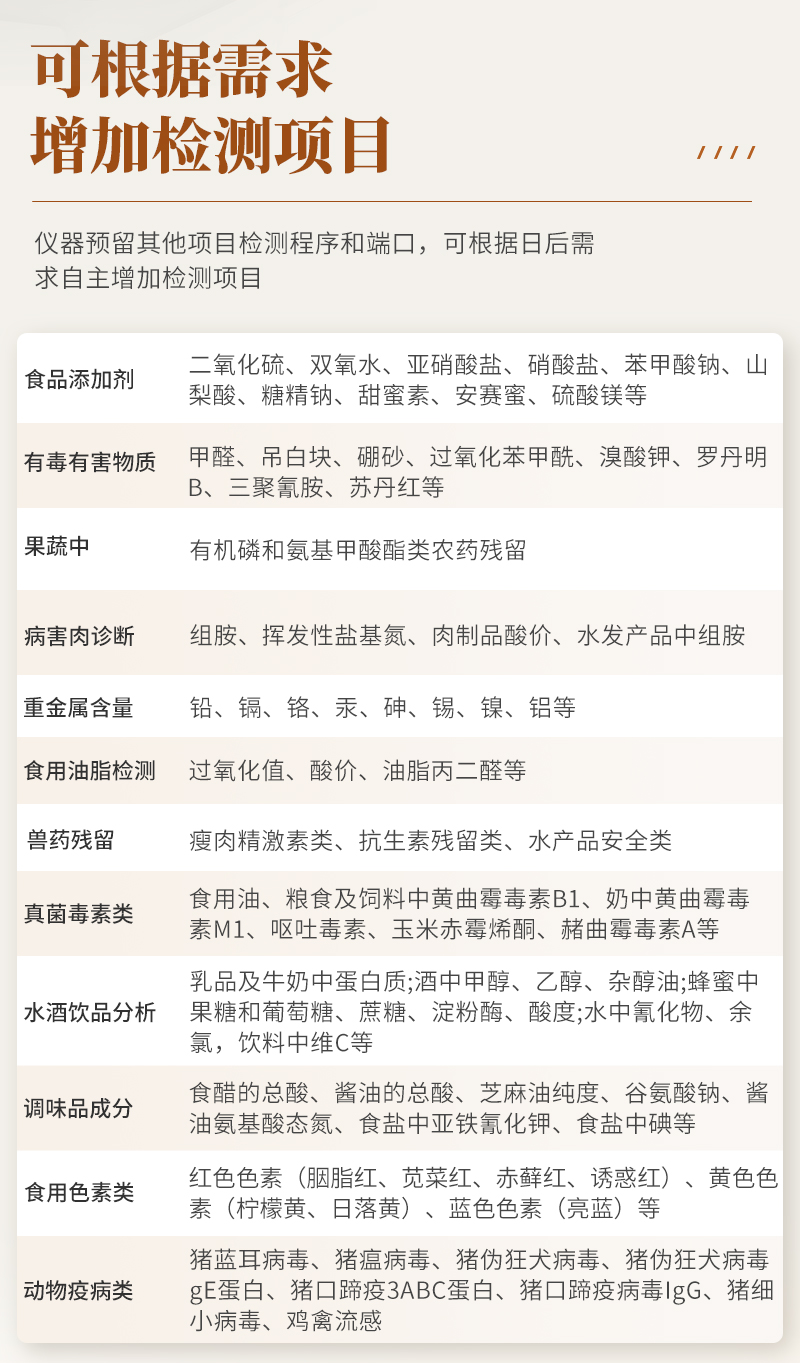 | 食品添加劑:二氧化硫、雙氧水、亞硝酸鹽、硝酸鹽、苯甲酸鈉、山梨酸鉀、糖精鈉、甜蜜素、木耳硫酸鎂等 | 有毒有害物質(zhì):甲醛、吊白塊、硼砂、過(guò)氧化苯甲酰、溴酸鉀、羅丹明B、三聚氰胺、蘇丹紅、工業(yè)堿、尿素、明礬等 | 食用油脂:過(guò)氧化值、酸價(jià)等 | 果蔬:農(nóng)藥殘留(酶抑制率法) | 病害肉:組胺、揮發(fā)性鹽基氮 | 重金屬含量:鉛、鎘、鉻、汞、砷、錫、鎳、鋁等 | 水酒飲品分析:酒中甲醇、乙醇、乳品及牛奶中蛋白質(zhì), | 蜂蜜成分:果糖和葡萄糖、蔗糖、淀粉酶、酸度等 | 調(diào)味品成分:食醋的總酸、醬油的總酸、芝麻油純度、谷氨酸鈉、醬油氨基酸態(tài)氮、食鹽中亞鐵氰化鉀、食鹽中碘等 | 食用色素類:紅色色素(胭脂紅、莧菜紅、莧菜紅)、黃色色素(檸檬黃、日落黃)、藍(lán)色色素(亮藍(lán))等 |