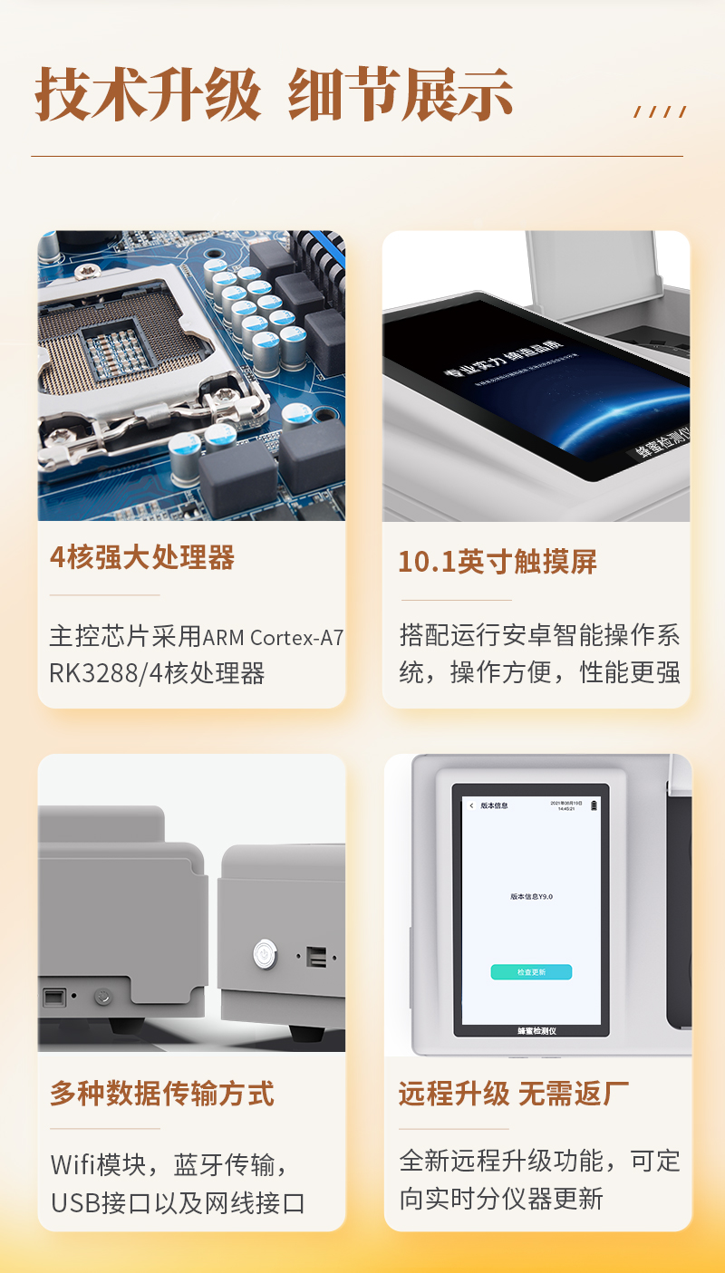 產(chǎn)品介紹: 山東天研儀器有限公司生產(chǎn)的高智能蜂蜜檢測(cè)儀為集成化食品安全快速檢測(cè)分析設(shè)備,采用臺(tái)式一體化設(shè)計(jì),可快速檢測(cè)200多種食品安全項(xiàng)目,包含非食用化學(xué)物質(zhì)、濫用食品添加劑、農(nóng)藥殘留、獸藥殘留、重金屬、病害肉、營(yíng)養(yǎng)強(qiáng)化劑、抗生素類殘留、激素類殘留、真菌毒素類殘留、化學(xué)類殘留等項(xiàng)目的定性