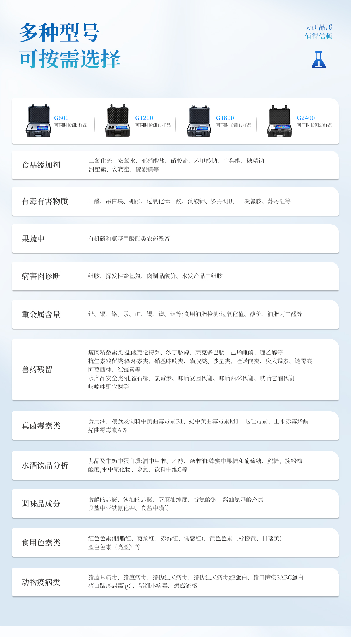 | 食品添加劑:二氧化硫、雙氧水、亞硝酸鹽、硝酸鹽、苯甲酸鈉、山梨酸、糖精鈉、甜蜜素、安賽蜜、硫酸鎂等 | 有毒有害物質:甲醛、吊白塊、硼砂、過氧化苯甲酰、溴酸鉀、羅丹明B、三聚氰胺、蘇丹紅等 | 果蔬中:有機磷和氨基甲酸酯類農藥殘留; | 病害肉診斷:組胺、揮發(fā)性鹽基氮、肉制品酸價、水發(fā)產品中組胺 | 重金屬含量:鉛、鎘、鉻、汞、砷、錫、鎳、鋁等;食用油脂檢測:過氧化值、酸價、油脂丙二醛等。 | 瘦肉精激素類(獸藥):鹽酸克倫特羅、沙丁胺醇、萊克多巴胺、己烯雌酚、喹乙醇等 | 抗生素殘留類(獸藥):四環(huán)素類、硝基呋喃類、磺胺類、沙星類、喹諾酮類、慶大霉素、鏈霉素、阿莫西林、紅霉素等 | 水產品安全類:孔雀石綠、氯霉素、呋喃妥因代謝、呋喃西林代謝、呋喃它酮代謝、呋喃唑酮代謝等 | 真菌毒素類:食用油、糧食及飼料中黃曲霉毒素B1、奶中黃曲霉毒素M1、嘔吐毒素、玉米赤霉烯酮、赭曲霉毒素A等 | 水酒飲品分析:乳品及牛奶中蛋白質;酒中甲醇、乙醇、雜醇油;蜂蜜中果糖和葡萄糖、蔗糖、淀粉酶、酸度;水中氰化物、余氯,飲料中維C等 | 調味品成分:食醋的總酸、醬油的總酸、芝麻油純度、谷氨酸鈉、醬油氨基酸態(tài)氮、食鹽中亞鐵氰化鉀、食鹽中碘等 | 食用色素類:紅色色素(胭脂紅、莧菜紅、赤蘚紅、誘惑紅)、黃色色素(檸檬黃、日落黃)、藍色色素(亮藍)等 | 動物疫病類:豬藍耳病毒、豬瘟病毒、豬偽狂犬病毒、豬偽狂犬病毒gE蛋白、豬口蹄疫3ABC蛋白、豬口蹄疫病毒IgG、豬細小病毒、雞禽流感等 |