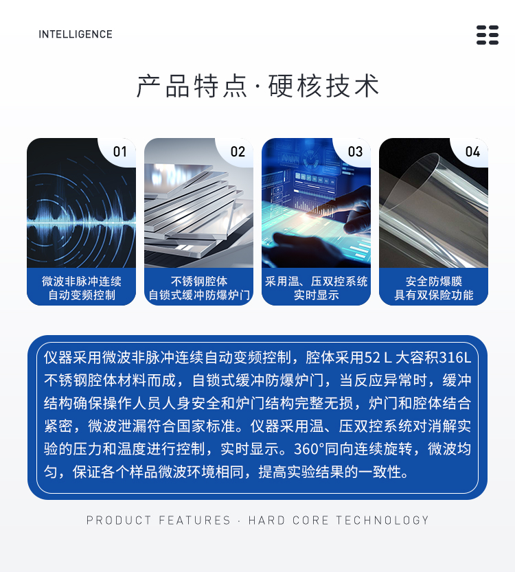 儀器采用微波非脈沖連續(xù)自動變頻控制,延長了儀器的使用壽命和電磁波的均勻性,腔體采用52L大容積316L不銹鋼腔體材料制成,自鎖式緩沖防爆爐門,當反應異常時,緩沖結構確保操作人員人身安全和爐門結構完整無損,爐門和腔體結合緊密,微波泄漏符合國家標準。儀器采用溫、壓雙控系統(tǒng)對消解實驗的壓力和溫度進行控制,實時顯示。360°同向連續(xù)旋轉,微波均勻,確定各個樣品微波環(huán)境相同,提高實驗結果的一致性。當罐內的壓力超過設定的保護值時,微波會自動停止加熱。安全防爆膜具有雙保險功能,當罐內的壓力超過防爆膜所能承受的壓力時,防爆膜先行破裂,氣體瀉出,防止罐體受損和對人體的傷害。