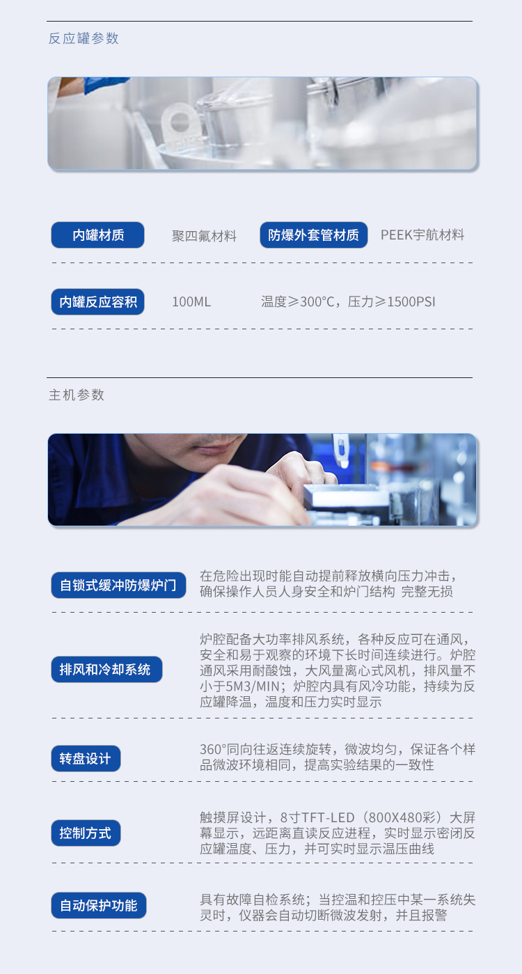 | 主機參數(shù);1.1電 源:220-240 VAC 50/60Hz 8A ; | 微波頻率:2450MHz; | 整機安裝功率:2600W; | (1)電源要求:220 VAC 50 Hz 15A; | (2)微波源: | (3)微波輸出功率 :0~1600W; | (4)微波輸出特性:微波非脈沖連續(xù)自動變頻控制,0~100%自動輸出; | (5)微波均勻性:垂直雙向波導設計,三維輸出技術,匹配諧波功頻實現(xiàn)了高度的場均勻性; | (6)微波腔體:52L,316級全不銹鋼腔體,6層防腐耐高溫特氟隆涂層; | (7)自鎖式緩沖防爆爐門,在危險出現(xiàn)時能自動提前釋放橫向壓力沖擊,確保操作人員人身安全和爐門結構 完整無損; | (8)排風和冷卻系統(tǒng):爐腔配備大功率排風系統(tǒng),各種反應可在通風,安全和易于觀察的環(huán)境下長時間連續(xù)進行。爐腔通風采用耐酸蝕,大風量離心式風機,排風量不小于5m3/min;爐腔內具有風冷功能,持續(xù)為反應罐降溫,溫度和壓力實時顯示。 | (9)轉盤設計:360°同向往返連續(xù)旋轉,微波均勻,保證各個樣品微波環(huán)境相同,提高實驗結果的一致性。 | (10)控制方式:觸摸屏設計,8寸TFT-LED(800X480彩)大屏幕顯示,遠距離直讀反應進程,實時顯示密閉反應罐溫度、壓力,并可實時顯示溫壓曲線; | (11)操作語言:中文簡體 | (12)自動保護功能:具有故障自檢系統(tǒng);當控溫和控壓中某一系統(tǒng)失靈時,儀器會自動切斷微波發(fā)射,并且報警; |