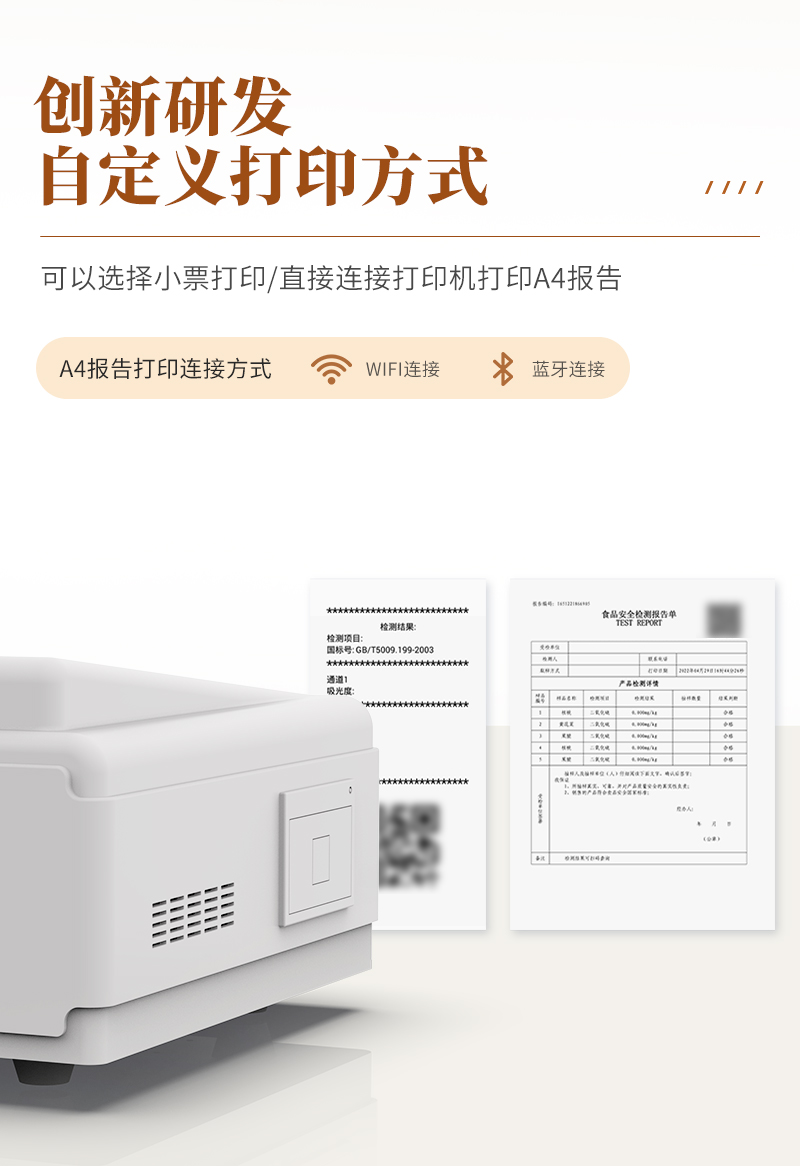 | 儀器采用手提式一體化系統(tǒng)檢測技術(shù),將分光光度模塊、膠體金檢測模塊、新型農(nóng)殘檢測模塊、數(shù)字化管理模塊、無線通訊模塊高度集成于一體,支持檢測200種食品安全檢測項目,同時預(yù)留升級檢測方法。 | 儀器檢測模塊標(biāo)準(zhǔn)化、智能化,可隨意自由組合。檢測箱體內(nèi)置多個標(biāo)準(zhǔn)檢測單元,檢測模塊可以調(diào)整配置。 | 儀器采用全新安卓智能系統(tǒng),主控芯片采用 ARM Cortex-A7,RK3288/4核處理器,10.1寸高清液晶觸摸豎屏,更加**的UI交互界面,運轉(zhuǎn)快捷;儀器配備無線通信模塊: 4G(APN)通訊模塊、Wifi模塊,藍(lán)牙傳輸,同時具有雙USB接口以及RJ45接口能以多種方式實現(xiàn)數(shù)據(jù)保存和數(shù)據(jù)傳輸功能。 | 創(chuàng)新檢測模式:★檢測通道:≥12通道;采用精密旋轉(zhuǎn)比色池設(shè)計,使用同芯片同光源校準(zhǔn)精度,解決不同光源之間的誤差值。1-12通道間誤差0.1%。(**號:ZL202022821055.2) | ★儀器具有自動識別比色皿檢測功能,即:將樣品比色皿放入儀器后,點擊樣品檢測,儀器自動識別比色皿進(jìn)行通道檢測。 | 進(jìn)口高精光源: | 高精度進(jìn)口四波長冷光源,通道配置 410、520、590、630nm 波長光源,一個光源芯片驅(qū)動一個光源,誤差極小,每臺設(shè)備單獨**校準(zhǔn)光源,**比對,同時參照四種不同波段光源全方位覆蓋市面上99%的農(nóng)殘食品項目檢測。 | 膠體金模塊檢測方式:★采用COMS實時成像技術(shù),單金標(biāo)實時讀卡,通過不同顏色的灰度變化,一秒精準(zhǔn)得出結(jié)果。 | 智能操作分析系統(tǒng):★便捷操作系統(tǒng):設(shè)備檢測時可在同一檢測界面自動對應(yīng)相關(guān)檢測通道一次性選擇1-12個樣品名稱,無須退出界面,節(jié)省操作時間。 | ★數(shù)據(jù)集成系統(tǒng):設(shè)備首頁自動統(tǒng)計檢測數(shù)據(jù)包含:周檢測數(shù)據(jù)、月檢測數(shù)據(jù),全部檢測總數(shù)量,均包含檢測總數(shù),合格數(shù),不合格數(shù),以及相關(guān)柱形分析圖,對各項檢測數(shù)據(jù)清晰掌握,無需電腦查詢,更加快捷直觀。 | ★項目預(yù)設(shè)系統(tǒng):支持添加單個及多個相同或不相同的任務(wù)預(yù)設(shè),一鍵快速調(diào)取,每一個任務(wù)分別可以設(shè)置不同的樣品、批次、編號、來源、備注、抽樣信息、檢測信息、受檢信息、復(fù)核信息等更多信息。無縫鏈接平臺和APP實時查看下發(fā)任務(wù)。 | ★數(shù)據(jù)監(jiān)管系統(tǒng):同步對接監(jiān)管平臺,數(shù)據(jù)可局域網(wǎng)和互聯(lián)網(wǎng)數(shù)據(jù)上傳,檢測結(jié)果可選擇直接傳至食品安全監(jiān)管平臺。集成OSS輸出存儲服務(wù)、區(qū)分設(shè)備定向管理應(yīng)用,進(jìn)行區(qū)域食品安全監(jiān)管及大數(shù)據(jù)分析處理與數(shù)據(jù)統(tǒng)計,檢測區(qū)域食品安全長短期動態(tài),達(dá)到食品安全問題預(yù)估、預(yù)警。 | ★自定義打印系統(tǒng):內(nèi)置全新打印系統(tǒng),新創(chuàng)自定義打印方式,可按需靈活設(shè)置開啟或關(guān)閉:產(chǎn)品合格證(國家農(nóng)業(yè)部標(biāo)準(zhǔn)要求),二維碼,抽樣信息、檢測信息,受檢信息、復(fù)核信息、抽樣日期、檢測日期等信息的打印。 | ★系統(tǒng)遠(yuǎn)程更新功能:可定向分客戶分儀器更新系統(tǒng),按照不同客戶后期實際需求添加項目,無需機(jī)器返廠,即可遠(yuǎn)程實時升級全新系統(tǒng),節(jié)省時間成本及避免運輸造成設(shè)備損壞。 | 儀器主機(jī)采用一體化防水、抗壓、防撞擊、防腐蝕箱體設(shè)計,同時配備交直流供電,可連接車載電源,可選配大容量充電鋰電池,滿足現(xiàn)場野外檢測需求。 | 安全證書,放心保障:儀器具有中國計量科學(xué)研究院校準(zhǔn)證書,**認(rèn)證。 |