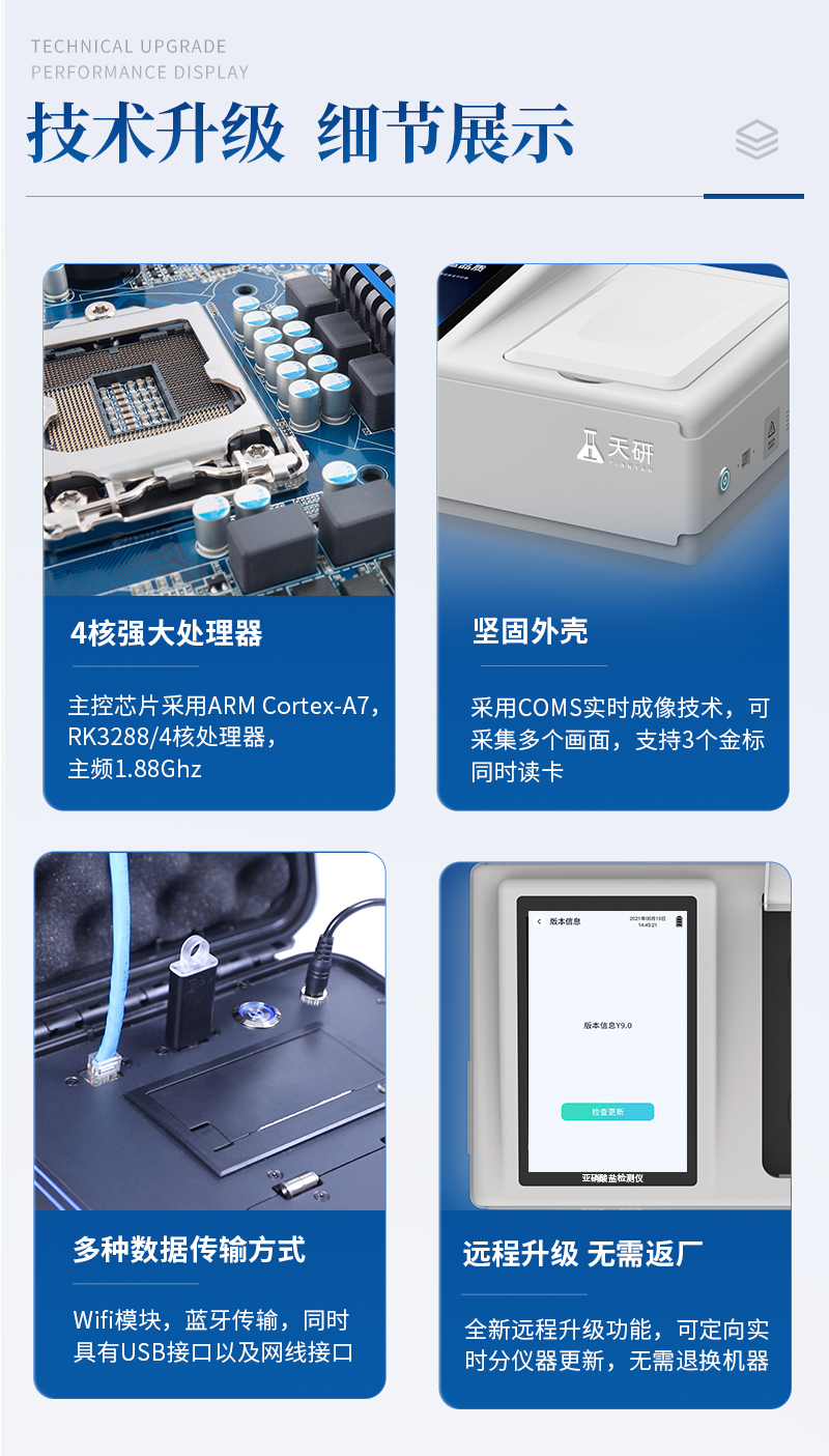 山東天研儀器有限公司生產(chǎn)的亞硝酸鹽檢測(cè)儀為集成化食品安全快速檢測(cè)分析設(shè)備,采用臺(tái)式一體化設(shè)計(jì),能夠快速檢測(cè)肉類(lèi)、肉類(lèi)罐頭、熏肉、香腸、奶制品、泡菜、腌制蔬菜等中的亞硝酸鹽含量;該儀器是根據(jù)GB5009.33-2010《食品中亞硝酸鹽與硝酸鹽的測(cè)定》,儀器預(yù)留其他項(xiàng)目檢測(cè)程序和端口,根據(jù)日后需求可遠(yuǎn)程升級(jí)增加檢測(cè)項(xiàng)目。日后可升級(jí)為檢測(cè)水產(chǎn)品、面制品的綜合類(lèi)型儀器