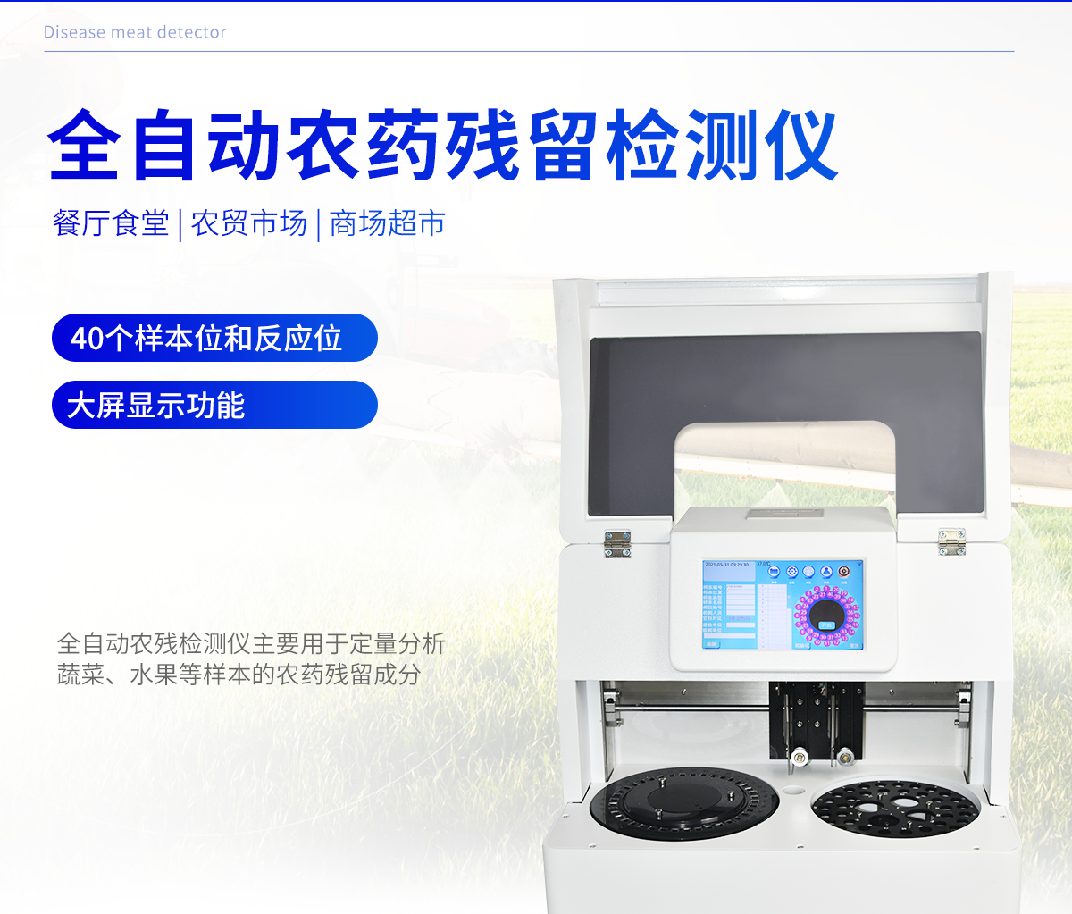 廣泛應用于主要用于蔬菜、水果、茶葉、糧食、農副產品等食品中有機磷和氨基甲酸酯類農藥殘留的快速檢測;此外還可用于果蔬茶生產基地和農貿批發(fā)銷售市場現場檢測,餐館、學校、食堂、家庭果蔬加工前的安全速測等,為廣大人民的生活安全提供保障。