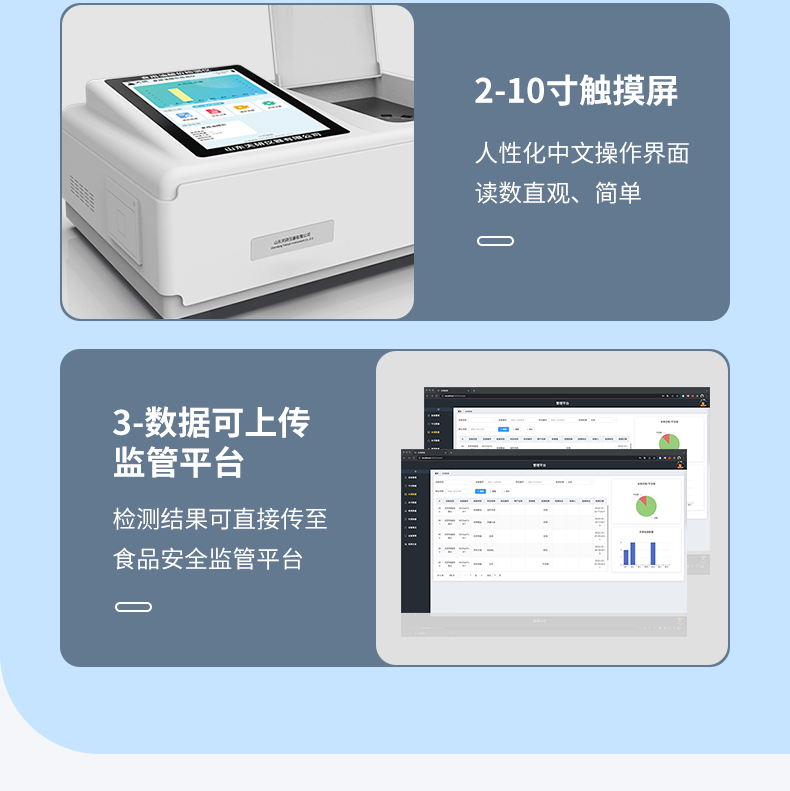 | 儀器采用臺式一體化系統(tǒng)檢測技術(shù),將分光光度模塊、新型農(nóng)殘檢測模塊、數(shù)字化管理模塊、無線通訊模塊高度集成于一體,支持檢測200種食品安全檢測項目,同時預(yù)留升級檢測方法。 | 儀器檢測模塊標準化、智能化,可隨意自由組合。檢測箱體內(nèi)置多個標準檢測單元,檢測模塊可以調(diào)整配置。 | 儀器采用全新安卓智能系統(tǒng),主控芯片采用 ARM Cortex-A7,RK3288/4核處理器,10.1寸高清液晶觸摸豎屏,更加**的UI交互界面,運轉(zhuǎn)快捷;儀器配備無線通信模塊: 4G(APN)通訊模塊、Wifi模塊,藍牙傳輸,同時具有雙USB接口以及RJ45接口能以多種方式實現(xiàn)數(shù)據(jù)保存和數(shù)據(jù)傳輸功能。 | 創(chuàng)新檢測模式: | ★檢測通道:≥12通道;采用精密旋轉(zhuǎn)比色池設(shè)計,使用同芯片同光源校準精度,解決不同光源之間的誤差值。1-12通道間誤差0.1%。(**號:ZL202022821055.2) | ★儀器具有自動識別比色皿檢測功能,即:將樣品比色皿放入儀器后,點擊樣品檢測,儀器自動識別比色皿進行通道檢測。 | 進口高精光源: | 高精度進口四波長冷光源,通道配置 410、520、590、630nm 波長光源,一個光源芯片驅(qū)動一個光源,誤差極小,每臺設(shè)備單獨**校準光源,**比對,同時參照四種不同波段光源全方位覆蓋市面上99%的農(nóng)殘食品項目檢測。 | 智能化操作系統(tǒng): | 便捷操作系統(tǒng):設(shè)備檢測時可在同一檢測界面自動對應(yīng)相關(guān)檢測通道一次性選擇1-12個樣品名稱,無須退出界面,節(jié)省操作時間。 | 數(shù)據(jù)集成系統(tǒng):設(shè)備首頁自動統(tǒng)計檢測數(shù)據(jù)包含:周檢測數(shù)據(jù)、月檢測數(shù)據(jù),全部檢測總數(shù)量,均包含檢測總數(shù),合格數(shù),不合格數(shù),以及相關(guān)柱形分析圖,對各項檢測數(shù)據(jù)清晰掌握,無需電腦查詢,更加快捷直觀。 | 項目預(yù)設(shè)系統(tǒng):支持添加單個及多個相同或不相同的任務(wù)預(yù)設(shè),一鍵快速調(diào)取,每一個任務(wù)分別可以設(shè)置不同的樣品、批次、編號、來源、備注、抽樣信息、檢測信息、受檢信息、復核信息等更多信息。無縫鏈接平臺和APP實時查看下發(fā)任務(wù)。 | 數(shù)據(jù)監(jiān)管系統(tǒng):同步對接監(jiān)管平臺,數(shù)據(jù)可局域網(wǎng)和互聯(lián)網(wǎng)數(shù)據(jù)上傳,檢測結(jié)果可選擇直接傳至食品安全監(jiān)管平臺。集成OSS輸出存儲服務(wù)、區(qū)分設(shè)備定向管理應(yīng)用,進行區(qū)域食品安全監(jiān)管及大數(shù)據(jù)分析處理與數(shù)據(jù)統(tǒng)計,檢測區(qū)域食品安全長短期動態(tài),達到食品安全問題預(yù)估、預(yù)警。 | 自定義打印系統(tǒng):內(nèi)置全新打印系統(tǒng),新創(chuàng)自定義打印方式,可按需靈活設(shè)置開啟或關(guān)閉:產(chǎn)品合格證(國家農(nóng)業(yè)部標準要求),二維碼,抽樣信息、檢測信息,受檢信息、復核信息、抽樣日期、檢測日期等信息的打印。 | 系統(tǒng)遠程更新功能:可定向分客戶分儀器更新系統(tǒng),按照不同客戶后期實際需求添加項目,無需機器返廠,即可遠程實時升級全新系統(tǒng),節(jié)省時間成本及避免運輸造成設(shè)備損壞。 | 儀器主機采用一體化防水、抗壓、防撞擊、防腐蝕箱體設(shè)計,同時配備交直流供電,可連接車載電源,可選配大容量充電鋰電池,滿足現(xiàn)場野外檢測需求。 | 安全證書,放心保障:儀器具有中國計量科學研究院校準證書,**認證。 |
