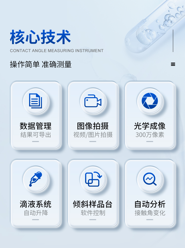 | 接觸角范圍:0~180° | 分辨率:0.01° | 接觸角測量方式:全自動、半自動、手動 | 分析方式:停滴法 (2/3 態(tài)) 、氣泡捕獲法、座滴法 | 分析方法:靜態(tài)分析、增液縮液動態(tài)分析、潤濕動態(tài)分析、實(shí)時分析、雙邊分析、前進(jìn)后退角分析 | 測試方法:圓法、橢圓/斜橢圓法、微分圓/微分橢圓法、Young- lapalace、寬高法、切線法、區(qū)間法 |