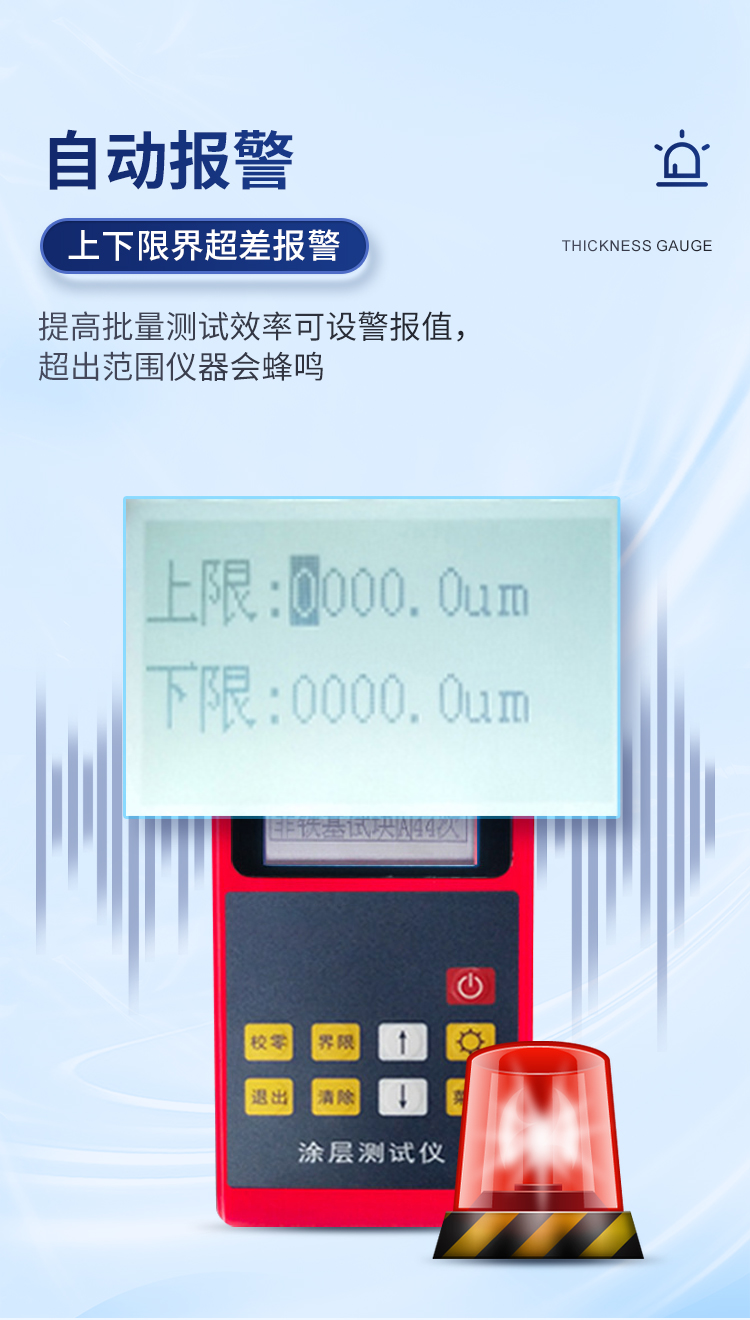 產(chǎn)品簡(jiǎn)介: 涂鍍層測(cè)厚儀是一款測(cè)量磁性金屬材料表面涂鍍層覆蓋層物體厚度的專(zhuān)業(yè)無(wú)損檢測(cè)儀器。采用磁性測(cè)厚方法,可無(wú)損地測(cè)量磁性金屬基體(如:鋼、鐵)上非磁性覆層的厚度(鍍鋅、鉻、錮、琺瑯、橡膠、粉末、油漆、電泳、搪瓷、噴塑、涂料、防腐防火涂層等),本儀器結(jié)構(gòu)精密牢固,重復(fù)性好,性能猶佳