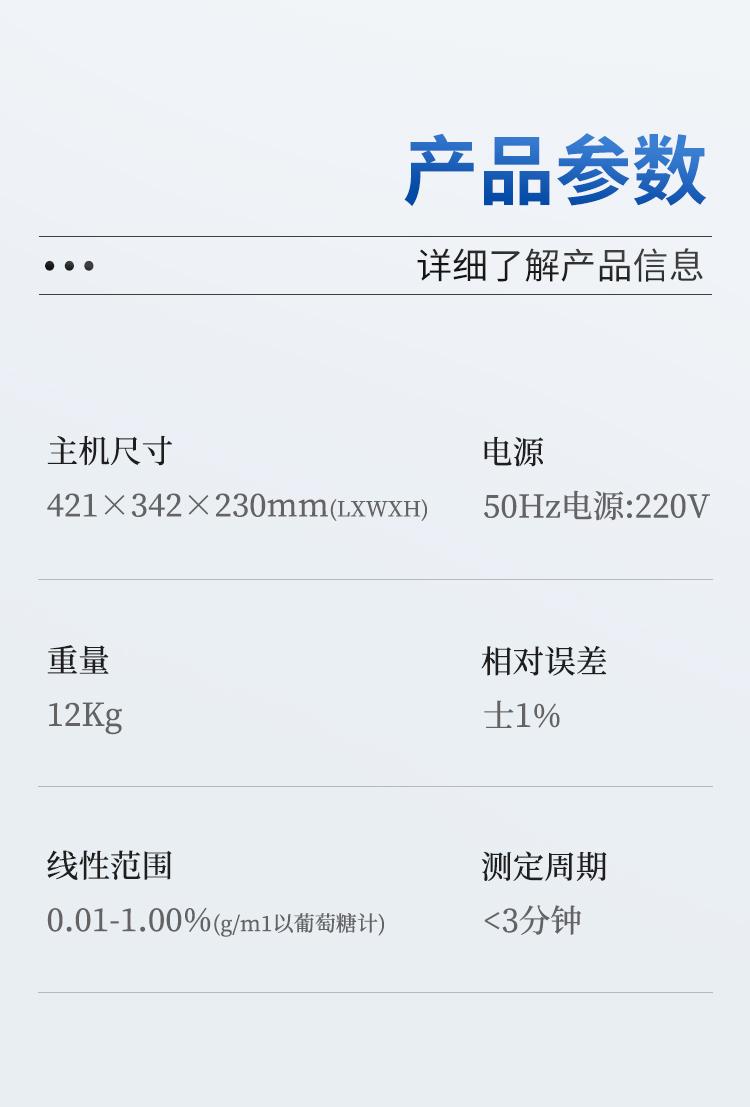 | 電源:50Hz電源:220V | 主機(jī)尺寸:421X342X230mm(LXWXH) | 重量:12Kg | 相對誤差:士1% | 線性范圍:0.01-1.00%(g/m1以葡萄糖計(jì))測定周期:<3分鐘 |