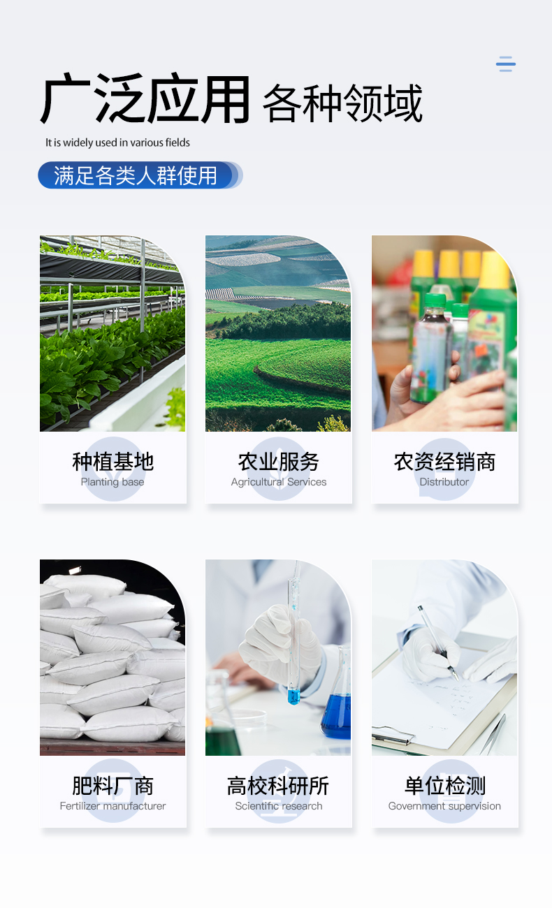 ●單質(zhì)肥:氮肥中銨態(tài)氮、肥料硝態(tài)氮、尿素氮、縮二脲、磷肥中磷、磷肥中水溶性磷、鉀肥中鉀; ●復(fù)合肥全氮、復(fù)合肥全磷、復(fù)合肥全鉀; ●有機(jī)肥全氮、有機(jī)肥全磷、有機(jī)肥全鉀、有機(jī)肥硝態(tài)氮、有機(jī)肥速效磷、有機(jī)肥速效鉀、有機(jī)肥酸解氮、有機(jī)質(zhì); ●水溶性腐植酸(風(fēng)化煤)、水溶性腐植酸(褐煤)、水溶性腐植酸(泥炭)、游離態(tài)腐植酸(風(fēng)化煤)、游離態(tài)腐植酸(褐煤)、游離態(tài)腐植酸(泥炭); ●水溶肥全氮、水溶肥全磷、水溶肥全鉀; ●葉面肥全氮、葉面肥全磷、葉面肥全鉀; ●各種肥料微量元素:肥料鈣、肥料鎂、肥料硫、肥料硅、肥料硼、肥料鐵、肥料銅、肥料錳、肥料鋅、肥料氯、肥料鉬; ●肥料重金屬:肥料鉛、肥料砷、肥料鎘、肥料鉻、肥料汞、肥料鎳、肥料鋁、肥料氟、肥料鈦、肥料硒。 |