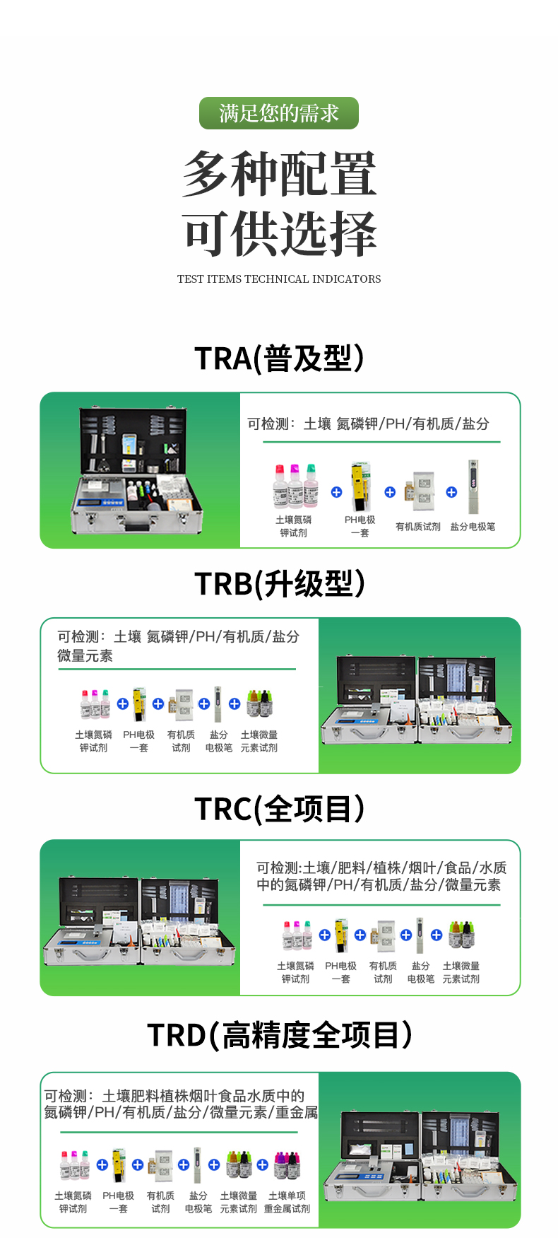 | 配套齊全:該儀器集藥、器、儀為一體,攜帶方便,相當(dāng)于一個小型實(shí)驗(yàn)室。適于農(nóng)業(yè)服務(wù)部門或農(nóng)資經(jīng)銷商、肥料廠商測土施肥和鑒別肥料真假。 | 操作簡便、速度快捷,成品藥劑開瓶即用,無須配置。 | 性能可靠:工作穩(wěn)定性優(yōu)于國家標(biāo)準(zhǔn)JJG179-90指標(biāo)的6倍,重復(fù)性達(dá)到光柵型分光光度計(jì)指標(biāo)水平。 |