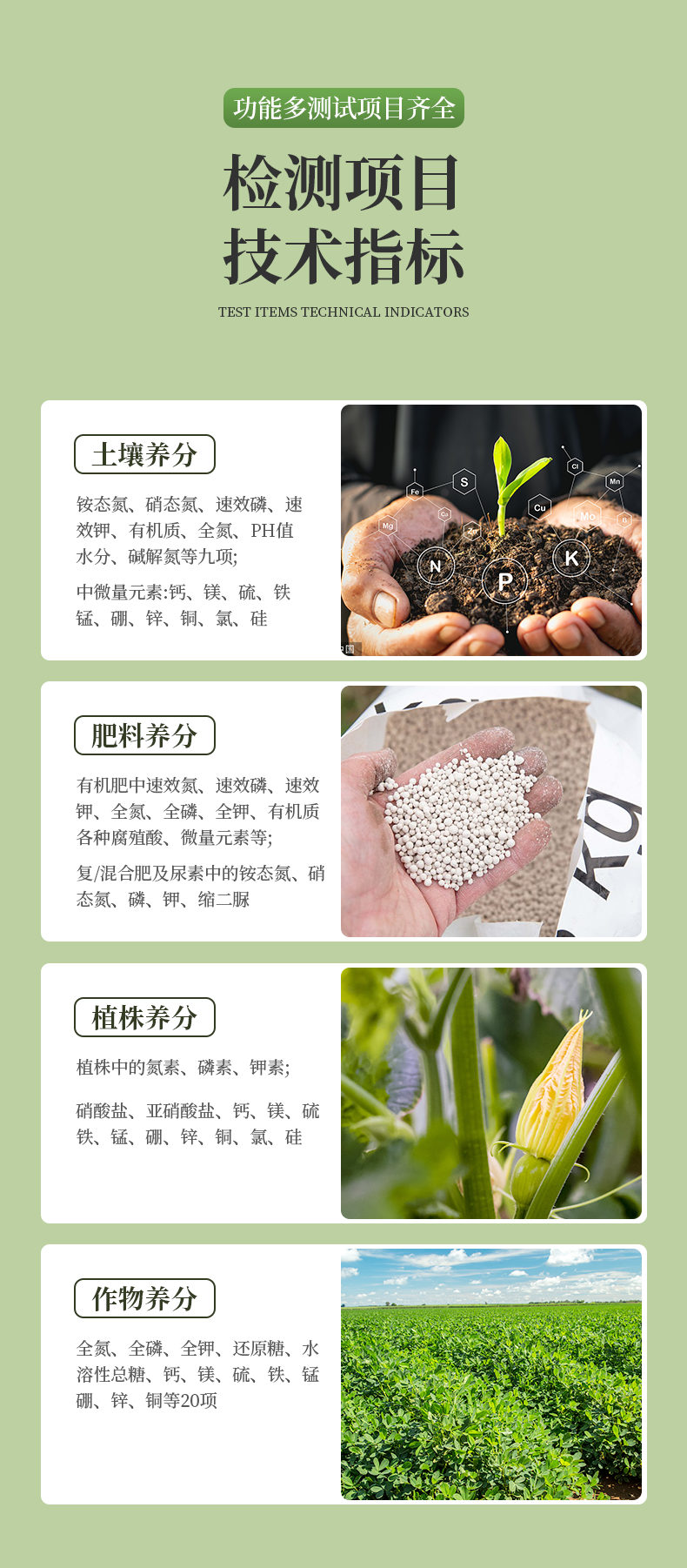 ●銨態(tài)氮、硝態(tài)氮、速效磷、速效鉀、有機(jī)質(zhì)、全氮、pH值、水份、堿解氮等九項; ●中微量元素:鈣、鎂、硫、鐵、錳、硼、鋅、銅、氯、硅、鉬等。 |