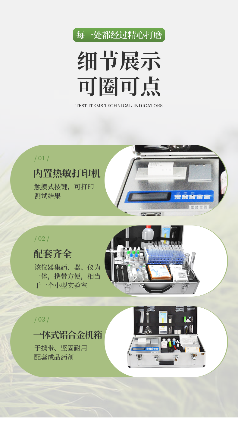 | 全項目土壤肥料養(yǎng)分檢測儀功能全:測試項目國內(nèi)外*全(各類藥劑均可選購)。 | 配套齊全:該儀器集藥、器、儀為一體,攜帶方便,相當(dāng)于一個小型實驗室。適于農(nóng)業(yè)服務(wù)部門或農(nóng)資經(jīng)銷商、肥料廠商測土施肥和鑒別肥料真假。 | 操作簡便、速度快捷,成品藥劑開瓶即用,無須配置。 |