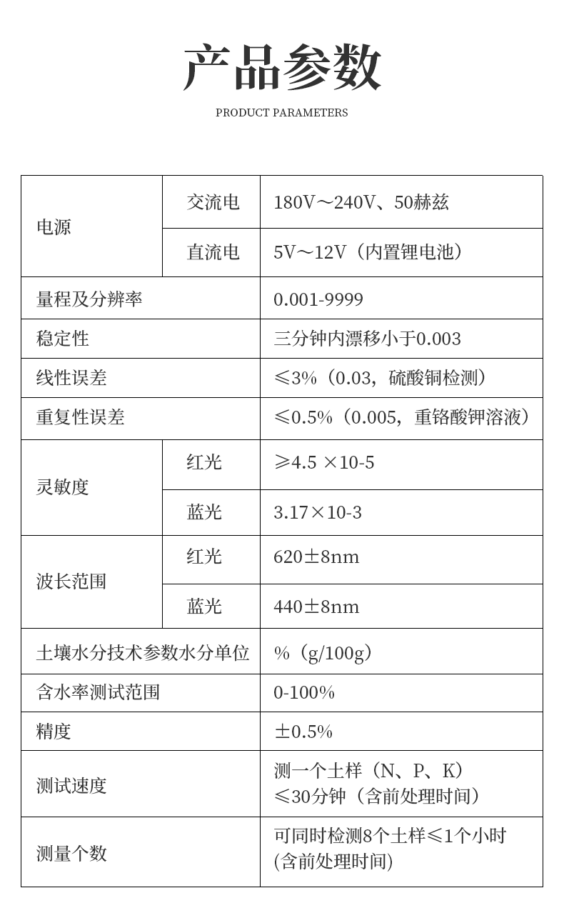 | 電源:交流電:180V~240V、50赫茲;直流電:12V+5V(可接車(chē)載電源) | 量程及分辨率:0.001-9999 | 穩(wěn)定性:三分鐘內(nèi)漂移小于0.003 | 線性誤差:≤2%(0.002,硫酸銅檢測(cè)) | 重復(fù)性誤差:≤0.5%(0.005,重鉻酸鉀溶液) | 靈敏度:紅光≥4.5 ×10-5 藍(lán)光≥3.17×10-3 | 波長(zhǎng)范圍:紅光620±8nm 藍(lán)光440±8nm | 肥料中氮(N)、磷(P)、鉀(K)等養(yǎng)分同時(shí)、快速、準(zhǔn)確檢測(cè) | 測(cè)試速度:測(cè)一個(gè)肥料樣(N、P、K)≤1個(gè)小時(shí)(含前處理時(shí)間) | 可同時(shí)檢測(cè)8個(gè)土樣≤3個(gè)小時(shí)(含前處理時(shí)間) | 數(shù)據(jù)打印:內(nèi)置新型一鍵式熱敏打印機(jī) |