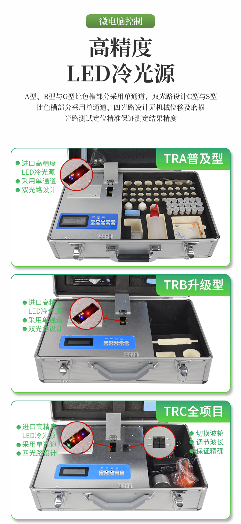 | 全國(guó)《機(jī)箱/藥劑一體式鋁合金機(jī)箱》設(shè)計(jì),便于攜帶、堅(jiān)固耐用,配套成品藥劑。 | 微電腦控制,數(shù)字化線路、程序化設(shè)計(jì),液晶顯示,交直流兩用,測(cè)試數(shù)據(jù)可存儲(chǔ)查詢,可野外流動(dòng)測(cè)試,**程度降低操作者的失誤和勞動(dòng)強(qiáng)度。 | 分辨率:0.001,觸摸式按鍵,內(nèi)置新一代熱敏打印機(jī),可打印測(cè)試結(jié)果。 | 肥料養(yǎng)分專(zhuān)用快速檢測(cè)儀可檢測(cè)化肥、有機(jī)肥中的速效氮、速效磷、有效鉀、全氮、全磷、全鉀、有機(jī)質(zhì)含量等。 | 采用高亮度 LED 燈作為光源, 硅半導(dǎo)體作為信號(hào)接收系統(tǒng), 壽命長(zhǎng)達(dá)10萬(wàn)小時(shí)級(jí)別。光源穩(wěn)定,一致性好。 | 比色槽部分采用單通道、雙光路設(shè)計(jì),無(wú)機(jī)械位移及磨損,光路測(cè)試定位**,保證測(cè)定結(jié)果精度。 | 采用自主發(fā)明分析方法,保證檢測(cè)結(jié)果絕對(duì)達(dá)到國(guó)標(biāo)要求。 | 肥料打印結(jié)果為百分含量,測(cè)試誤差小于1%。 |