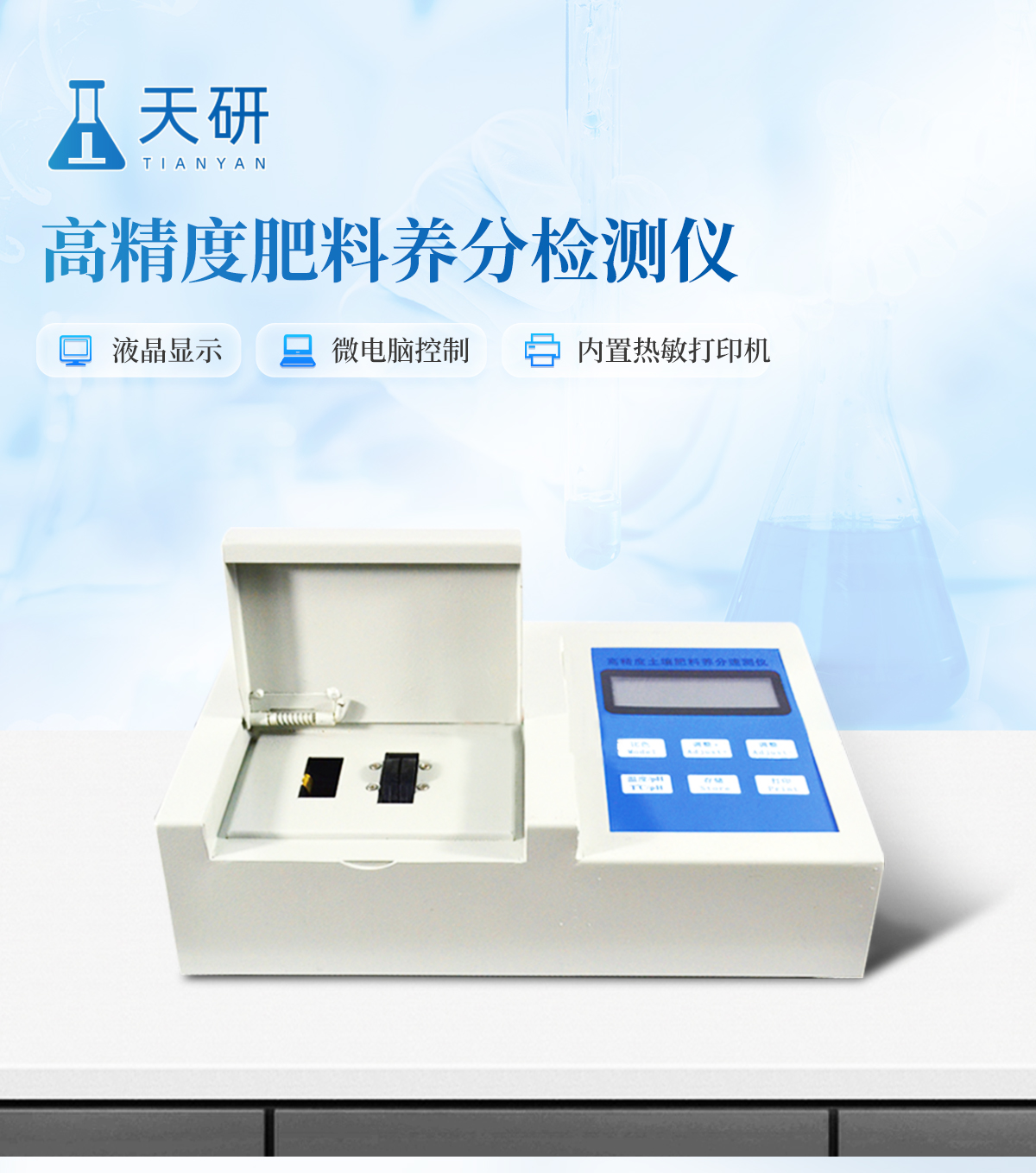 | 升級款,噴塑鋼板外殼設計,堅固耐用,配套成套附件及成品藥劑。 | 微電腦控制,數字化線路、程序化設計,液晶顯示,交直流兩用,可野外流動測試。 | 分辨率:0.001,觸摸式按鍵,內置新一代熱敏打印機,可打印測試結果。 | 肥料養(yǎng)分專用檢測儀可檢測化肥、有機肥(含葉面肥、水溶肥、噴施肥等)中的速效氮、速效磷、有效鉀、全氮、全磷、全鉀、有機質、酸堿度,鈣、鎂、硫、鐵、錳、硼、鋅、銅、氯、硅等各種中微量元素以及鉛、鉻、鎘、汞、砷等各種重金屬含量。 | 采用高亮LED燈光源、雙撥輪濾光式處理技術,保證光源波長穩(wěn)定, 硅半導體作為信號接收系統(tǒng),壽命長達10萬小時級別。光源穩(wěn)定,重現(xiàn)性好,準確度高。 | 比色槽部分采用單通道設計,無機械位移及磨損,光路測試定位**,保證測定結果精度。 | 采用自主分析方法(號:ZL 2018 2 1777724.7),保證檢測結果絕對達到國標要求。 | 內置熱敏打印機,肥料打印結果為百分含量,測試誤差小于0.5%。 |