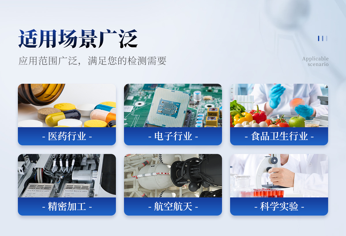 滿足醫(yī)藥行業(yè)(制藥廠、藥檢所、醫(yī)院手術(shù)室等);電子行業(yè)(半導(dǎo)體工廠、精密機械的生產(chǎn)加工等);食品衛(wèi)生行業(yè)(乳制品、塑封肉食品、調(diào)味食品、農(nóng)產(chǎn)品等的精加工);過濾器的生產(chǎn)廠家,檢驗過濾器的質(zhì)量及效率等;光學(xué)、及航空航天等領(lǐng)域的精加工、精密試驗所需的潔凈室(區(qū))的檢測需要。