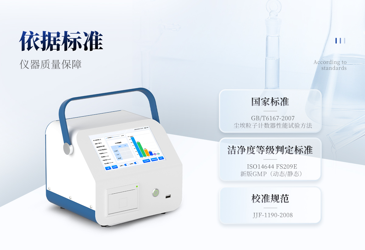 國家標(biāo)準(zhǔn):GB/T6167-2007塵埃粒子計數(shù)器性能試驗方法 潔凈度等級判定標(biāo)準(zhǔn):ISO14644 FS209E ,新版GMP(動態(tài)/靜態(tài)) 校準(zhǔn)規(guī)范:JJF-1190-2008