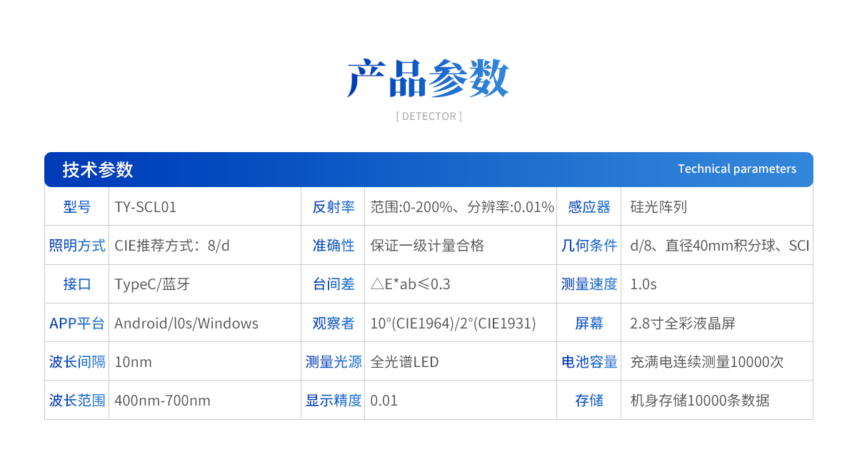 TY-SCL01色差儀全新升級款!采用Type C充電接口,內(nèi)置鋰電池充電,測量按鍵長按開機測量,采用黑白手動校準技術(shù),保證每一次測量的顏色數(shù)據(jù)一致性穩(wěn)過計量。功能亮點:①高精度分光結(jié)構(gòu),測量數(shù)據(jù)**穩(wěn)定d/8測量結(jié)構(gòu)、SCI模式,D65光源,支持多種測量方式保證**測量條件。重復(fù)精度ΔE*ab≤0.03,臺間差ΔE*ab≤0.3,數(shù)據(jù)