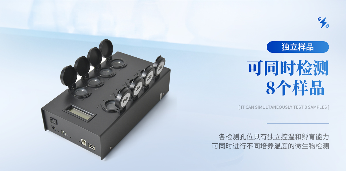 大腸桿菌檢測(cè)儀主要特點(diǎn):1) 可檢測(cè)固態(tài)、液態(tài)、表面、膏狀、漿狀樣本2) 樣本在檢測(cè)時(shí)無需任何的前處理過程,直接丟入檢測(cè)瓶即可3) 可自動(dòng)控制孵育溫度和孵育時(shí)間4) 檢測(cè)樣本只需1ml/1g;同一溫度下可同時(shí)檢測(cè)8個(gè)樣品5) 靈敏度高達(dá)可檢測(cè)到1目標(biāo)微生物;特異性高達(dá)99.999%6) 獨(dú)立、持續(xù)的檢測(cè)并記錄瓶中的微生物數(shù)量(CFU)7)