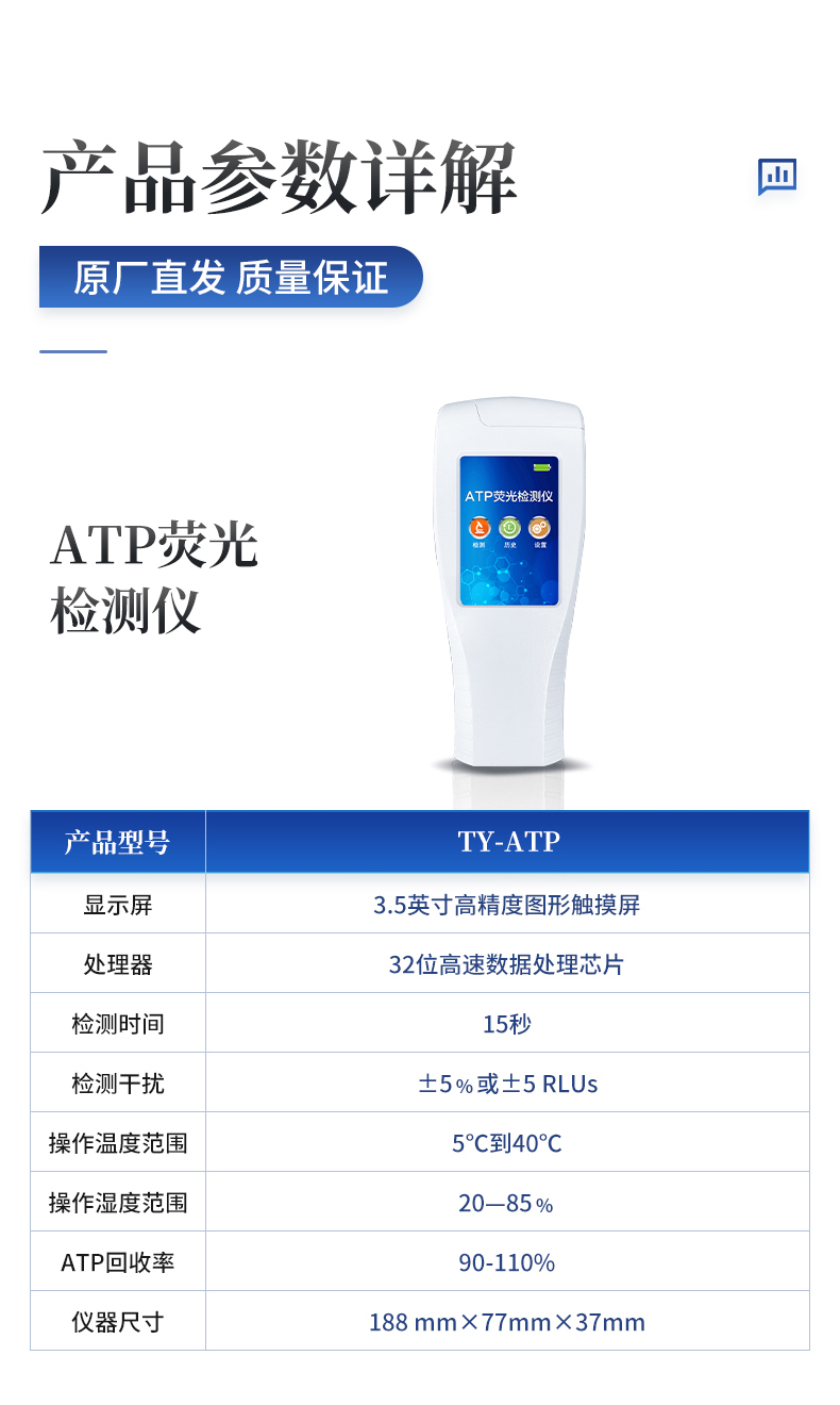 該設(shè)備為全新升級(jí)產(chǎn)品,大屏幕觸摸顯示屏,代替?zhèn)鹘y(tǒng)按鍵。操作采用生物化學(xué)反應(yīng)方法檢測(cè)ATP含量,ATP熒光檢測(cè)儀基于螢火蟲(chóng)發(fā)光原理,利用“熒光素酶—熒光素體系”快速檢測(cè)三磷酸腺苷(ATP)。ATP拭子含有可以裂解細(xì)胞膜的試劑,能將細(xì)胞內(nèi)ATP釋放出來(lái),與試劑中含有的特異性酶發(fā)生反應(yīng),產(chǎn)生光,再用熒光照度計(jì)檢測(cè)發(fā)光值,微生物的數(shù)量與發(fā)光值成正比,由于所有生物活細(xì)胞中含有恒量的ATP,所以ATP含量可以清晰地表明樣品中微生物與其他生物殘余的多少,用于判斷衛(wèi)生狀況。