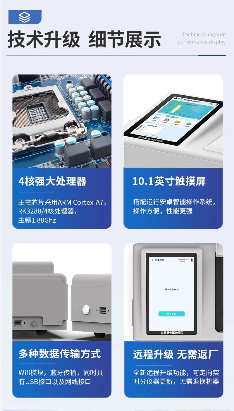 | 儀器采用臺(tái)式一體化系統(tǒng)檢測(cè)技術(shù),將分光光度模塊、數(shù)字化管理模塊、無(wú)線通訊模塊高度集成于一體,可支持檢測(cè)60種食品安全檢測(cè)項(xiàng)目,同時(shí)預(yù)留升級(jí)檢測(cè)方法。 | 儀器檢測(cè)模塊標(biāo)準(zhǔn)化、智能化,檢測(cè)項(xiàng)目可隨意自由組合。檢測(cè)箱體內(nèi)置多個(gè)標(biāo)準(zhǔn)檢測(cè)單元,檢測(cè)模塊可以調(diào)整配置。 | 儀器采用全新安卓智能系統(tǒng),主控芯片采用 ARM Cortex-A7,RK3288/4核處理器,10.1寸高清液晶觸摸豎屏,更加**的UI交互界面,運(yùn)轉(zhuǎn)快捷;儀器配備無(wú)線通信模塊: 4G(APN)通訊模塊、Wifi模塊,藍(lán)牙傳輸,同時(shí)具有雙USB接口以及RJ45接口能以多種方式實(shí)現(xiàn)數(shù)據(jù)保存和數(shù)據(jù)傳輸功能。 | 顯示屏幕:儀器采用10.1英寸豎向液晶觸摸屏顯,搭配運(yùn)行安卓智能操作系統(tǒng),主控芯片采用ARM Cortex-A7,RK3288/4核處理器,主頻1.88Ghz,操作方便,性能更強(qiáng)。 | 檢測(cè)通道:≥12通道;采用精密旋轉(zhuǎn)比色池設(shè)計(jì),使用同芯片同光源校準(zhǔn)精度,解決不同光源之間的誤差值,更加準(zhǔn)確**。(1-12通道間誤差0.1%,**號(hào):ZL202022821055.2) | 儀器光源:高精度進(jìn)口四波長(zhǎng)冷光源,每個(gè)通道均配置 410、520、590、630nm 波長(zhǎng)光源,標(biāo)配**的光路切換裝置,**光路切換功能可實(shí)現(xiàn)64波長(zhǎng),并且所有檢測(cè)項(xiàng)目可實(shí)現(xiàn)所有通道同時(shí)檢測(cè)。 | 設(shè)備可一鍵校準(zhǔn),自動(dòng)保存校準(zhǔn)數(shù)據(jù),自動(dòng)對(duì)比校驗(yàn),得到精準(zhǔn)光源,采用Android SP存儲(chǔ)數(shù)據(jù),光源數(shù)據(jù)永不丟失,方便每一次使用。 | 通訊接口:配備無(wú)線通信模塊、4G(APN)通訊模塊、藍(lán)牙傳輸,同時(shí)具有雙USB接口以及RJ45網(wǎng)線接口,可以多方式實(shí)現(xiàn)數(shù)據(jù)保存及數(shù)據(jù)傳輸。 | 存儲(chǔ)方式:支持U盤存儲(chǔ),標(biāo)準(zhǔn)USB接口,免驅(qū)動(dòng)安裝。檢測(cè)結(jié)果存儲(chǔ)容量20萬(wàn)條以上,可生成Excel表格進(jìn)行拷貝,并具有登錄保護(hù)功能。 | 智能化操作系統(tǒng): | 1、操作系統(tǒng):儀器可在同一檢測(cè)界面自動(dòng)對(duì)應(yīng)相關(guān)檢測(cè)通道,一次性選擇1-12個(gè)樣品名稱,無(wú)需退出界面,節(jié)省操作時(shí)間。并可以對(duì)每個(gè)通道屬性和樣品信息單獨(dú)進(jìn)行編輯,例如送檢單位、人員,檢測(cè)人員等,打印時(shí)勾選打印顯示。 | 2、數(shù)據(jù)集成系統(tǒng):設(shè)備首頁(yè)自動(dòng)匯總分析檢測(cè)數(shù)據(jù),包含:周檢測(cè)數(shù)據(jù)、月檢測(cè)數(shù)據(jù),全部檢測(cè)總數(shù)量,均包含檢測(cè)總數(shù),合格數(shù),不合格數(shù),以及相關(guān)柱形分析圖,各項(xiàng)檢測(cè)數(shù)據(jù)一目了然,無(wú)需電腦查詢,更加快捷直觀。 | 3、數(shù)據(jù)庫(kù)系統(tǒng):十幾項(xiàng)數(shù)據(jù)庫(kù)分類管理儀器:包含項(xiàng)目類型、項(xiàng)目數(shù)據(jù)、檢測(cè)數(shù)據(jù)、歷史記錄、國(guó)標(biāo)信息、曲線信息、采樣信息、檢測(cè)信息、受檢信息、復(fù)核信息、圖表信息、光源校準(zhǔn)信息、打印樣式信息、樣品庫(kù)信息等等,數(shù)據(jù)庫(kù)之間互相協(xié)調(diào)聯(lián)動(dòng)保證數(shù)據(jù)的真實(shí)完整性。同時(shí)產(chǎn)品數(shù)據(jù)庫(kù)以及歷史檢測(cè)記錄支持一鍵檢索功能。 | 4、限量規(guī)判系統(tǒng):具有限量查詢、添加物質(zhì)合規(guī)判定系統(tǒng)。檢測(cè)出結(jié)果后,系統(tǒng)自動(dòng)調(diào)用系統(tǒng)數(shù)據(jù)庫(kù)中相關(guān)國(guó)標(biāo)進(jìn)行比對(duì)判定,客觀顯示判定結(jié)果是否合格。 | 5、項(xiàng)目預(yù)設(shè)系統(tǒng):儀器具有任務(wù)預(yù)設(shè)模塊,一鍵提前預(yù)設(shè),給出方便快捷的新檢測(cè)方案,每一個(gè)任務(wù)分別可以設(shè)置不同的樣品、批次、編號(hào)、來源、備注、抽樣信息、檢測(cè)信息、受檢信息、復(fù)核信息等更多信息。樣品送檢時(shí)一鍵調(diào)取保存信息,并可多次調(diào)取,大大提高檢測(cè)效率。 | 6、數(shù)據(jù)監(jiān)管系統(tǒng):同步對(duì)接監(jiān)管平臺(tái),數(shù)據(jù)可局域網(wǎng)和互聯(lián)網(wǎng)數(shù)據(jù)上傳,檢測(cè)結(jié)果可選擇直接傳至食品安全監(jiān)管平臺(tái)。進(jìn)行區(qū)域食品安全監(jiān)管及大數(shù)據(jù)分析處理與數(shù)據(jù)統(tǒng)計(jì),檢測(cè)區(qū)域食品安全長(zhǎng)短期動(dòng)態(tài),達(dá)到食品安全問題預(yù)估、預(yù)警。 | 7、全新打印系統(tǒng):內(nèi)置全新打印機(jī),新創(chuàng)自定義打印方式,可按需靈活勾選控制:二維碼,抽樣信息、檢測(cè)信息,受檢信息、復(fù)核信息、抽樣日期、檢測(cè)日期等信息的打印。 | 8、A4紙版本報(bào)告打印功能(可選配):設(shè)備擁有兩種結(jié)果展示方式,可以自動(dòng)生成A4打印模板和小票打印模板兩種樣式,可通過WiFi及網(wǎng)線等方式鏈接外置打印機(jī)可進(jìn)行打印。 | 供電模式:儀器交直流兩用,直流12V供電,可連接車載電源,可配6ah大容量充電鋰電池,電量可實(shí)時(shí)顯示,方便戶外流動(dòng)測(cè)試。 
