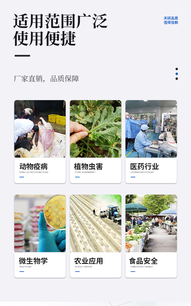 產(chǎn)品用途: 該膠體金檢測儀適用于豬、雞、鴨、羊、牛、牛奶等畜禽肉產(chǎn)品中獸藥殘留,包括抗生素類殘留、瘦肉精激素類殘留和水產(chǎn)品有毒有害物質(zhì)的現(xiàn)場快速篩查定及性定量檢測。 該多功能獸藥殘留檢測儀為集成化肉品安全快速檢測分析設(shè)備,可廣泛應(yīng)用于畜牧養(yǎng)殖場、屠宰場、食品肉產(chǎn)品深加工企業(yè)、食藥監(jiān)局