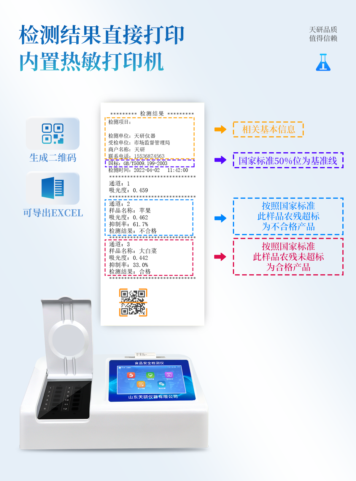 | 安卓智能操作系統(tǒng),采用更加**和人性化操作,儀器具有網(wǎng)線連接、wifi聯(lián)網(wǎng)上傳、GPRS無線遠(yuǎn)傳功能,快速上傳數(shù)據(jù)。 | 智能化程度高,儀器具有自檢功能:具有開機(jī)自檢和調(diào)零功能,具有自動檢測重復(fù)性功能。 | 檢測通道:≥12個(gè)檢測通道,可以同時(shí)測試多個(gè)樣品,每個(gè)樣品由程序控制分別獨(dú)立工作,不會互相干擾。 | 顯示方式:≥8英寸液晶觸摸屏顯示,人性化中文操作界面,讀數(shù)直觀、簡單。 | 配備新一代嵌入式熱敏打印機(jī),可選擇手動打印或者自動打印,檢測完成可自動打印檢測報(bào)告和二維碼。 | 光源采用進(jìn)口超高亮發(fā)光二極管,高精度、穩(wěn)定性強(qiáng)、光源可控、可以關(guān)掉不使用的光源,功耗更低。 | 采用USB2.0接口設(shè)計(jì),方便數(shù)據(jù)的存貯和移動,并可隨時(shí)與計(jì)算機(jī)直接相連,并且可用計(jì)算機(jī)控制儀器。實(shí)現(xiàn)數(shù)據(jù)查詢、瀏覽、分析、統(tǒng)計(jì)、打印等。 | 儀器帶有監(jiān)管平臺。數(shù)據(jù)可局域網(wǎng)和互聯(lián)網(wǎng)數(shù)據(jù)上傳,檢測結(jié)果直接傳至食品安全監(jiān)管平臺。進(jìn)行區(qū)域食品安全監(jiān)管及大數(shù)據(jù)分析處理,檢測區(qū)域食品安全長短期動態(tài),達(dá)到食品安全問題預(yù)估、預(yù)警 | 一體化便攜式快檢設(shè)備,滿足現(xiàn)場及流動檢測使用需求,能夠在同一軟件下實(shí)現(xiàn)所有檢測項(xiàng)目的檢測,并可通過同一窗口直觀顯示檢測結(jié)果。 | 儀器具有多品類多種類樣品菜單庫,可靈活選擇檢測樣品,不同的檢測通道可同時(shí)檢測不同的樣品項(xiàng)目。也可在儀器上直接編輯錄入樣品名稱、檢測指標(biāo)、送檢單位等信息并保存進(jìn)樣品數(shù)據(jù)庫。 | 樣品處理簡單省力,整體操作快速、安全、便捷。 | 儀器具有自身保護(hù)功能,可設(shè)置用戶名及密碼,防止非工作人員操作等。 | 高靈敏度,高檢測精度,高重復(fù)性精度,掃描式高精度光學(xué)傳感器。 | 儀器具有重新校準(zhǔn)、鎖定、恢復(fù)出廠設(shè)置功能。 | 支持U盤存儲。 結(jié)果判定線可修改,對照值標(biāo)定值可保存,斷電不丟失數(shù)據(jù)。 |