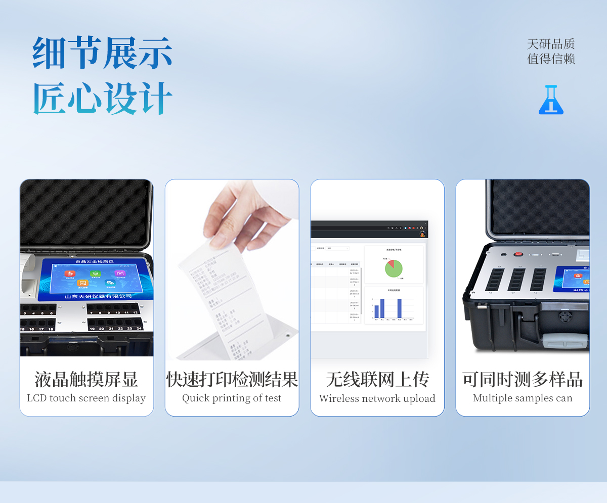 多功能食品安全檢測儀可快速檢測200多項(xiàng)目,包含非食用化學(xué)物質(zhì)、濫用食品添加劑、農(nóng)藥殘留、獸藥殘留、重金屬、病害肉、營養(yǎng)強(qiáng)化劑、抗生素類殘留、激素類殘留、真菌毒素類殘留、化學(xué)類殘留等現(xiàn)場的定性定量檢測。該多功能食品安全檢測儀為集成化食品安全快速檢測分析設(shè)備,廣泛應(yīng)用于市場監(jiān)管局、檢測中心、衛(wèi)生監(jiān)督部門、農(nóng)業(yè)部門、院校及各單位食堂、食品肉產(chǎn)品深加工企業(yè)、商超市場、司法部門、餐飲機(jī)構(gòu)、養(yǎng)殖場、屠宰場、檢驗(yàn)檢疫部門等單位使用。