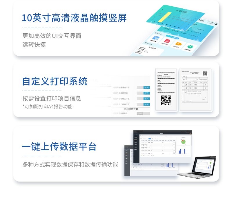 | 安卓智能操作系統(tǒng),采用更加**和人性化操作,儀器具有無線聯(lián)網(wǎng)上傳功能,快速上傳數(shù)據(jù),進行數(shù)據(jù)統(tǒng)計和分析。 | 智能化程度高,儀器具有自檢功能:具有開機自檢和調(diào)零功能,具有自動檢測重復(fù)性功能;同時,檢測完成可自動打印檢測報告和二維碼。手機掃碼可顯示出詳細(xì)檢測信息。 | 儀器帶有監(jiān)管平臺,數(shù)據(jù)可局域網(wǎng)和互聯(lián)網(wǎng)數(shù)據(jù)上傳,檢測結(jié)果直接傳至食品安全監(jiān)管平臺。進行區(qū)域食品安全監(jiān)管及大數(shù)據(jù)分析處理與數(shù)據(jù)統(tǒng)計,檢測區(qū)域食品安全長短期動態(tài),達到食品安全問題預(yù)估、預(yù)警 。 | 樣品處理簡單省力,整體操作快速、安全、便捷。 | 儀器具有自身保護功能,可設(shè)置用戶名及密碼,防止非工作人員操作等。 | 內(nèi)置強大的數(shù)據(jù)庫,可在儀器上直接選擇樣品名稱、檢測指標(biāo)、送檢單位等信息,也可在儀器上直接編輯錄入樣品名稱、檢測指標(biāo)、送檢單位等信息并保存進樣品數(shù)據(jù)庫,方便后期操作調(diào)取使用。 | 儀器具有重新校準(zhǔn)、鎖定、恢復(fù)出廠設(shè)置功能。 |