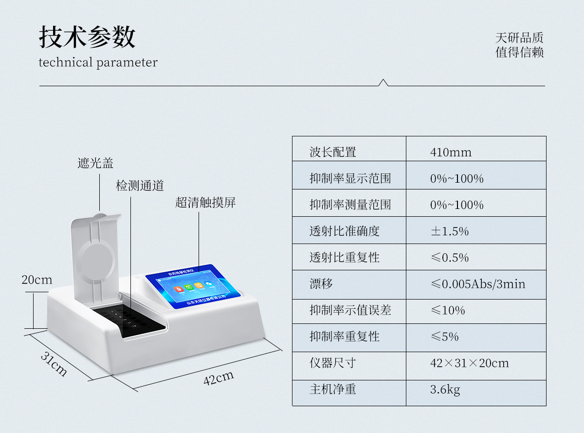 | 乙酰膽堿酯酶和丁酰膽堿酯酶試劑均可以使用,符合國(guó)家標(biāo)準(zhǔn)和農(nóng)業(yè)部標(biāo)準(zhǔn)的要求。 | 自動(dòng)判斷樣品是否合格,檢測(cè)結(jié)果更加直觀。 | 儀器具有100多種蔬菜名稱菜單庫(kù),分類管理,并可按需添加或刪除蔬菜名,編輯蔬菜名稱,可直接打印出蔬菜名稱。 | 檢測(cè)通道:10個(gè)檢測(cè)通道,可以同時(shí)測(cè)試多個(gè)樣品,循環(huán)檢測(cè),即放即檢,每個(gè)樣品由程序控制分別獨(dú)立工作,不會(huì)互相干擾。 | 智能操作系統(tǒng),采用更加人性化操作,主控采用多核處理器,主頻1.88Ghz,運(yùn)轉(zhuǎn)速度更快速,穩(wěn)定性更強(qiáng)。 | 顯示方式:7英寸高靈敏真彩觸摸屏顯示,人性化中文操作界面,讀數(shù)直觀、簡(jiǎn)單。 | 打印機(jī)采用串口5v打印,可選擇手動(dòng)打印或者自動(dòng)打印,三分鐘出打印結(jié)果,打印格式為檢測(cè)人姓名、吸光度差值、檢測(cè)時(shí)間、檢測(cè)機(jī)構(gòu)、樣品名稱及結(jié)果判定。 | 光源采用進(jìn)口超高亮發(fā)光二極管,具有低功耗、高精度、穩(wěn)定性強(qiáng)、光源可控可以關(guān)掉不使用的光源,響應(yīng)速度快等優(yōu)點(diǎn)。 | 智能恒流穩(wěn)壓,光強(qiáng)自動(dòng)校準(zhǔn),長(zhǎng)時(shí)間連續(xù)工作光源無(wú)溫漂現(xiàn)象。 | 儀器具有GPRS遠(yuǎn)傳功能,可插手機(jī)卡實(shí)現(xiàn)數(shù)據(jù)遠(yuǎn)傳平臺(tái),wifi聯(lián)網(wǎng)功能,可將數(shù)據(jù)快速上傳電腦,進(jìn)行數(shù)據(jù)管理與統(tǒng)計(jì)。 | 采用USB2.0接口設(shè)計(jì),方便數(shù)據(jù)的存貯和移動(dòng),并可隨時(shí)與計(jì)算機(jī)直接相連,并且可用計(jì)算機(jī)控制儀器。實(shí)現(xiàn)數(shù)據(jù)查詢、瀏覽、分析、統(tǒng)計(jì)、打印等。 | 智能化程度高,儀器具有自檢功能:具有開機(jī)自檢和調(diào)零功能,具有自動(dòng)檢測(cè)重復(fù)性功能 | 儀器具有自身保護(hù)功能,可設(shè)置用戶名及密碼,防止非工作人員操作等。 | 采用DC12v直流供電,安全系統(tǒng)更高,并且配備6A鋰電池充電器。 | 儀器具有重新校準(zhǔn)、鎖定、恢復(fù)出廠設(shè)置功能。 |