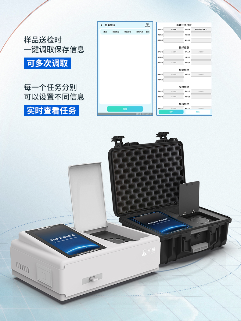 | 儀器采用臺式一體化系統(tǒng)檢測技術,將分光光度模塊、膠體金檢測模塊、新型農(nóng)殘檢測模塊、數(shù)字化管理模塊、無線通訊模塊高度集成于一體,支持檢測200種食品安全檢測項目,同時預留升級檢測方法。 | 儀器檢測模塊標準化、智能化,可隨意自由組合。檢測箱體內(nèi)置多個標準檢測單元,檢測模塊可以調整配置。 | 儀器采用全新安卓智能系統(tǒng),主控芯片采用 ARM Cortex-A7,RK3288/4核處理器,10.1寸高清液晶觸摸豎屏,更加**的UI交互界面,運轉快捷;儀器配備無線通信模塊: 4G(APN)通訊模塊、Wifi模塊,藍牙傳輸,同時具有雙USB接口以及RJ45接口能以多種方式實現(xiàn)數(shù)據(jù)保存和數(shù)據(jù)傳輸功能。 | 創(chuàng)新檢測模式: | ★檢測通道:≥12通道;采用精密旋轉比色池設計,使用同芯片同光源校準精度,解決不同光源之間的誤差值。1-12通道間誤差0.1%。(**號:ZL202022821055.2) | ★儀器具有自動識別比色皿檢測功能,即:將樣品比色皿放入儀器后,點擊樣品檢測,儀器自動識別比色皿進行通道檢測。 | 進口高精光源: | 高精度進口四波長冷光源,通道配置 410、520、590、630nm 波長光源,一個光源芯片驅動一個光源,誤差極小,每臺設備單獨**校準光源,**比對,同時參照四種不同波段光源全方位覆蓋市面上99%的農(nóng)殘食品項目檢測。 | 膠體金模塊檢測方式: | 采用COMS實時成像技術,可采集多個畫面,支持3個金標同時讀卡,通過不同顏色的灰度變化,一秒精準得出結果。 | 智能化操作系統(tǒng): | 便捷操作系統(tǒng):設備檢測時可在同一檢測界面自動對應相關檢測通道一次性選擇1-12個樣品名稱,無須退出界面,節(jié)省操作時間。 | 數(shù)據(jù)集成系統(tǒng):設備首頁自動統(tǒng)計檢測數(shù)據(jù)包含:周檢測數(shù)據(jù)、月檢測數(shù)據(jù),全部檢測總數(shù)量,均包含檢測總數(shù),合格數(shù),不合格數(shù),以及相關柱形分析圖,對各項檢測數(shù)據(jù)清晰掌握,無需電腦查詢,更加快捷直觀。 | 項目預設系統(tǒng):支持添加單個及多個相同或不相同的任務預設,一鍵快速調取,每一個任務分別可以設置不同的樣品、批次、編號、來源、備注、抽樣信息、檢測信息、受檢信息、復核信息等更多信息。無縫鏈接平臺和APP實時查看下發(fā)任務。 | 數(shù)據(jù)監(jiān)管系統(tǒng):同步對接監(jiān)管平臺,數(shù)據(jù)可局域網(wǎng)和互聯(lián)網(wǎng)數(shù)據(jù)上傳,檢測結果可選擇直接傳至食品安全監(jiān)管平臺。集成OSS輸出存儲服務、區(qū)分設備定向管理應用,進行區(qū)域食品安全監(jiān)管及大數(shù)據(jù)分析處理與數(shù)據(jù)統(tǒng)計,檢測區(qū)域食品安全長短期動態(tài),達到食品安全問題預估、預警。 | 自定義打印系統(tǒng):內(nèi)置全新打印系統(tǒng),新創(chuàng)自定義打印方式,可按需靈活設置開啟或關閉:產(chǎn)品合格證(國家農(nóng)業(yè)部標準要求),二維碼,抽樣信息、檢測信息,受檢信息、復核信息、抽樣日期、檢測日期等信息的打印。 | 系統(tǒng)遠程更新功能:可定向分客戶分儀器更新系統(tǒng),按照不同客戶后期實際需求添加項目,無需機器返廠,即可遠程實時升級全新系統(tǒng),節(jié)省時間成本及避免運輸造成設備損壞。 | 儀器主機采用一體化防水、抗壓、防撞擊、防腐蝕箱體設計,同時配備交直流供電,可連接車載電源,可選配大容量充電鋰電池,滿足現(xiàn)場野外檢測需求。 | 安全證書,放心保障:儀器具有中國計量科學研究院校準證書,**認證。 |