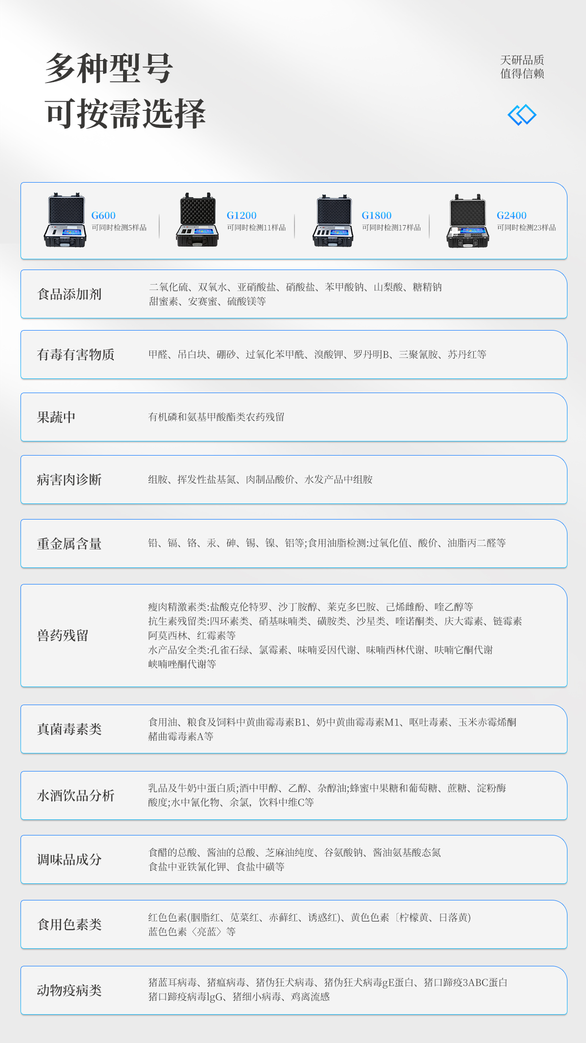 | 儀器采用手提式一體化系統(tǒng)檢測(cè)技術(shù),將分光光度模塊、新型農(nóng)殘檢測(cè)模塊、數(shù)字化管理模塊、無(wú)線通訊模塊高度集成于一體,支持檢測(cè)200種食品安全檢測(cè)項(xiàng)目,同時(shí)預(yù)留升級(jí)檢測(cè)方法。 | 儀器檢測(cè)模塊標(biāo)準(zhǔn)化、智能化,檢測(cè)項(xiàng)目可隨意自由組合。檢測(cè)箱體內(nèi)置多個(gè)標(biāo)準(zhǔn)檢測(cè)單元,檢測(cè)模塊可以調(diào)整配置。 | 顯示屏幕:儀器采用10.1英寸豎向液晶觸摸屏顯,搭配運(yùn)行安卓智能操作系統(tǒng),主控芯片采用ARM Cortex-A7,RK3288/4核處理器,主頻1.88Ghz,操作方便,性能更強(qiáng)。 | 檢測(cè)通道:≥12通道;采用精密旋轉(zhuǎn)比色池設(shè)計(jì),使用同芯片同光源校準(zhǔn)精度,解決不同光源之間的誤差值,更加準(zhǔn)確**。(1-12通道間誤差0.1%,**號(hào):ZL202022821055.2) | 儀器光源:高精度進(jìn)口四波長(zhǎng)冷光源,每個(gè)通道均配置 410、520、590、630nm 波長(zhǎng)光源,標(biāo)配**的光路切換裝置,**光路切換功能可實(shí)現(xiàn)64波長(zhǎng),并且所有檢測(cè)項(xiàng)目可實(shí)現(xiàn)所有通道同時(shí)檢測(cè)。 | 設(shè)備可一鍵校準(zhǔn),自動(dòng)保存校準(zhǔn)數(shù)據(jù),自動(dòng)對(duì)比校驗(yàn),得到精準(zhǔn)光源,采用Android SP存儲(chǔ)數(shù)據(jù),光源數(shù)據(jù)永不丟失,方便每一次使用。 | 通訊接口:配備無(wú)線通信模塊、4G(APN)通訊模塊、藍(lán)牙傳輸,同時(shí)具有雙USB接口以及RJ45網(wǎng)線接口,可以多方式實(shí)現(xiàn)數(shù)據(jù)保存及數(shù)據(jù)傳輸 | 存儲(chǔ)方式:支持U盤存儲(chǔ),標(biāo)準(zhǔn)USB接口,免驅(qū)動(dòng)安裝。檢測(cè)結(jié)果存儲(chǔ)容量20萬(wàn)條以上,可生成Excel表格進(jìn)行拷貝,并具有登錄保護(hù)功能。 | 智能化操作系統(tǒng): | 1)操作系統(tǒng):儀器可在同一檢測(cè)界面自動(dòng)對(duì)應(yīng)相關(guān)檢測(cè)通道,一次性選擇1-12個(gè)樣品名稱,無(wú)需退出界面,節(jié)省操作時(shí)間。并可以對(duì)每個(gè)通道屬性和樣品信息單獨(dú)進(jìn)行編輯,例如送檢單位、人員,檢測(cè)人員等,打印時(shí)勾選打印顯示。 | 2)數(shù)據(jù)集成系統(tǒng):設(shè)備首頁(yè)自動(dòng)匯總分析檢測(cè)數(shù)據(jù),包含:周檢測(cè)數(shù)據(jù)、月檢測(cè)數(shù)據(jù),全部檢測(cè)總數(shù)量,均包含檢測(cè)總數(shù),合格數(shù),不合格數(shù),以及相關(guān)柱形分析圖,各項(xiàng)檢測(cè)數(shù)據(jù)一目了然,無(wú)需電腦查詢,更加快捷直觀。 | 3)數(shù)據(jù)庫(kù)系統(tǒng):十幾項(xiàng)數(shù)據(jù)庫(kù)分類管理儀器:包含項(xiàng)目類型、項(xiàng)目數(shù)據(jù)、檢測(cè)數(shù)據(jù)、歷史記錄、國(guó)標(biāo)信息、曲線信息、采樣信息、檢測(cè)信息、受檢信息、復(fù)核信息、圖表信息、光源校準(zhǔn)信息、打印樣式信息、樣品庫(kù)信息等等,數(shù)據(jù)庫(kù)之間互相協(xié)調(diào)聯(lián)動(dòng)保證數(shù)據(jù)的真實(shí)完整性。同時(shí)產(chǎn)品數(shù)據(jù)庫(kù)以及歷史檢測(cè)記錄支持一鍵檢索功能。 | 4)限量規(guī)判系統(tǒng):具有限量查詢、添加物質(zhì)合規(guī)判定系統(tǒng)。檢測(cè)出結(jié)果后,系統(tǒng)自動(dòng)調(diào)用系統(tǒng)數(shù)據(jù)庫(kù)中相關(guān)國(guó)標(biāo)進(jìn)行比對(duì)判定,客觀顯示判定結(jié)果是否合格。 | 5)項(xiàng)目預(yù)設(shè)系統(tǒng):儀器具有任務(wù)預(yù)設(shè)模塊,一鍵提前預(yù)設(shè),給出方便快捷的新檢測(cè)方案,每一個(gè)任務(wù)分別可以設(shè)置不同的樣品、批次、編號(hào)、來(lái)源、備注、抽樣信息、檢測(cè)信息、受檢信息、復(fù)核信息等更多信息。樣品送檢時(shí)一鍵調(diào)取保存信息,并可多次調(diào)取,大大提高檢測(cè)效率。 | 6)數(shù)據(jù)監(jiān)管系統(tǒng):同步對(duì)接監(jiān)管平臺(tái),數(shù)據(jù)可局域網(wǎng)和互聯(lián)網(wǎng)數(shù)據(jù)上傳,檢測(cè)結(jié)果可選擇直接傳至食品安全監(jiān)管平臺(tái)。進(jìn)行區(qū)域食品安全監(jiān)管及大數(shù)據(jù)分析處理與數(shù)據(jù)統(tǒng)計(jì),檢測(cè)區(qū)域食品安全長(zhǎng)短期動(dòng)態(tài),達(dá)到食品安全問(wèn)題預(yù)估、預(yù)警。 | 7)打印系統(tǒng):內(nèi)置全新打印機(jī),新創(chuàng)自定義打印方式,可按需靈活勾選控制:產(chǎn)品合格證(國(guó)家農(nóng)業(yè)部標(biāo)準(zhǔn)要求),二維碼,抽樣信息、檢測(cè)信息,受檢信息、復(fù)核信息、抽樣日期、檢測(cè)日期等信息的打印。 | 供電模式:儀器交直流兩用,直流12V供電,可連接車載電源,可配6ah大容量充電鋰電池,電量可實(shí)時(shí)顯示,方便戶外流動(dòng)測(cè)試。 | 膠體金檢測(cè)模塊:采用雙通道CMOS成像處理技術(shù)及膠體金免疫層析技術(shù),可同時(shí)讀取雙膠體金卡數(shù)據(jù),自動(dòng)采集、處理分析,將檢測(cè)結(jié)果顯示,并可根據(jù)參考限值自動(dòng)判斷檢測(cè)結(jié)果,可檢測(cè)常見的獸藥殘留、生物毒素、抗生素、違禁添加物等。 | 1)探測(cè)技術(shù):CMOS成像探測(cè); | 2)檢測(cè)通道:1個(gè)通道; | 3)檢測(cè)方式:消線法和比色法; | 4)顯示模式:陰性或陽(yáng)性; | 5)曲