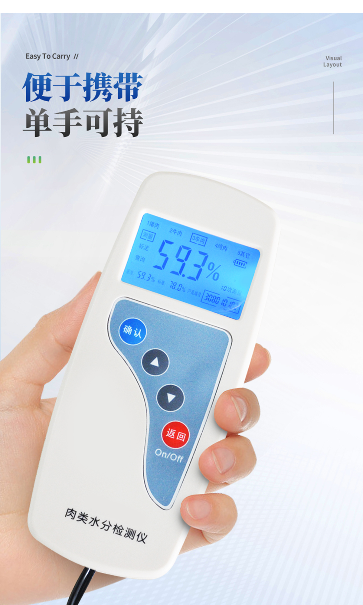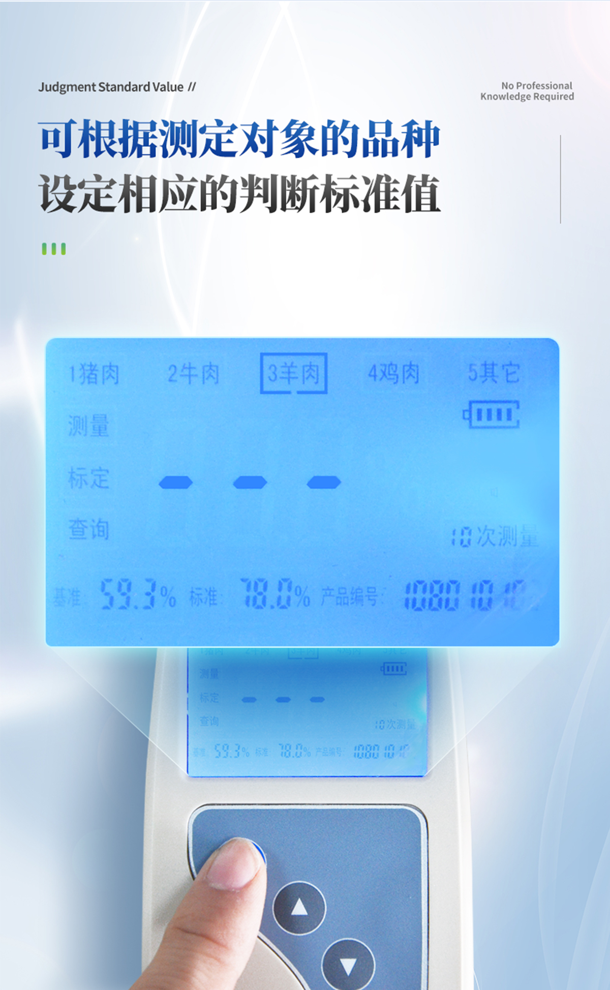 肉類水分檢測(cè)儀主要用于快速豬肉、牛肉、雞肉等動(dòng)物肉類水分含量,從而判斷所測(cè)樣品是否為注水肉,該儀器設(shè)計(jì)精巧,單手可持,儀器可根據(jù)測(cè)定對(duì)象的品種,設(shè)定相應(yīng)的判斷標(biāo)準(zhǔn)值。