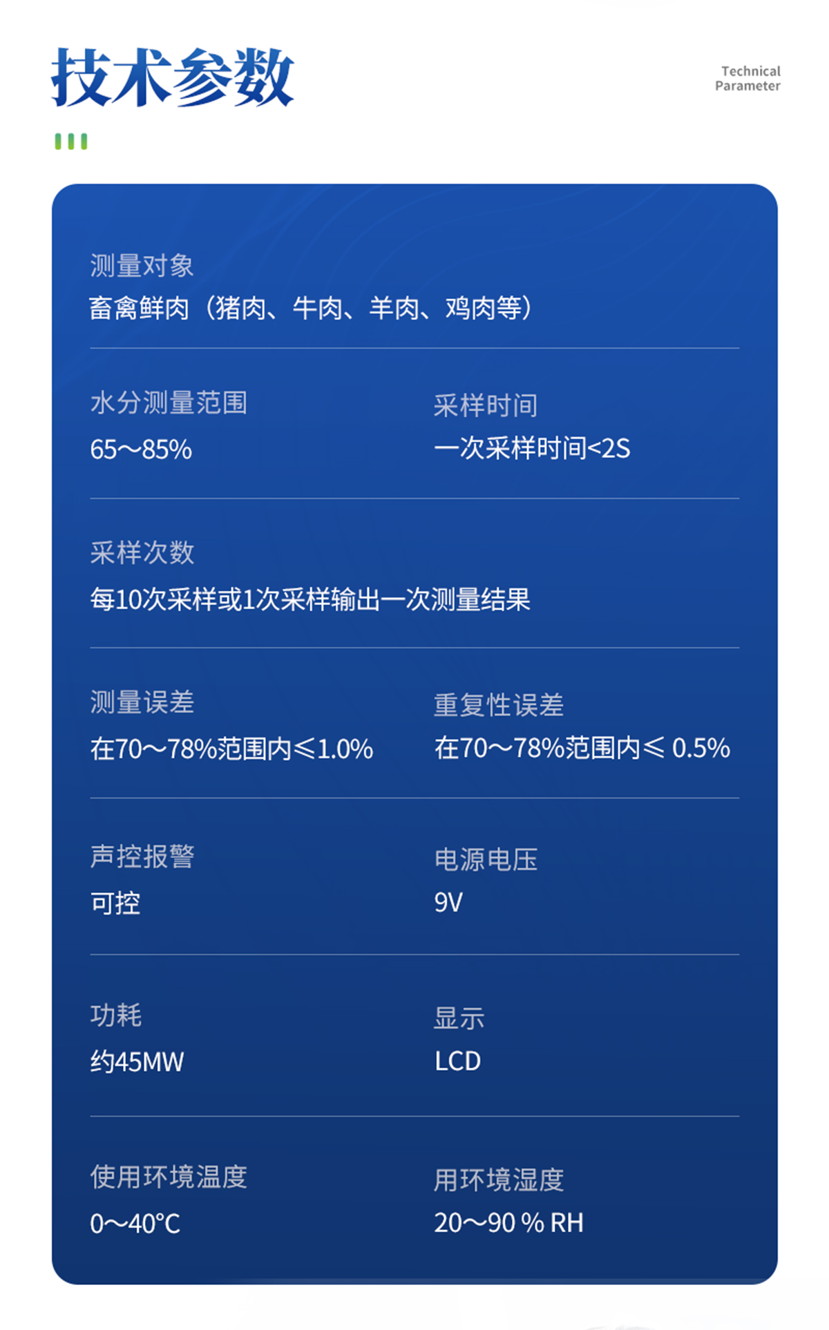 | 畜禽鮮肉(豬肉、牛肉、羊肉、雞肉等) | 65~85% | 一次采樣時(shí)間< 1s | 每10次采樣或1次采樣輸出一次測(cè)量結(jié)果 | 在70~78%范圍內(nèi)≤1.0% | 在70~78%范圍內(nèi)≤ 0.5% | 超標(biāo)報(bào)警 | 可設(shè)定每個(gè)品種的判斷標(biāo)準(zhǔn)。 | 交直流兩用 | 觸摸式按鍵 | 45mW | 167×70×30mm | 藍(lán)色背光LCD | 0~40℃ | 20~90 % RH | USB接口 |