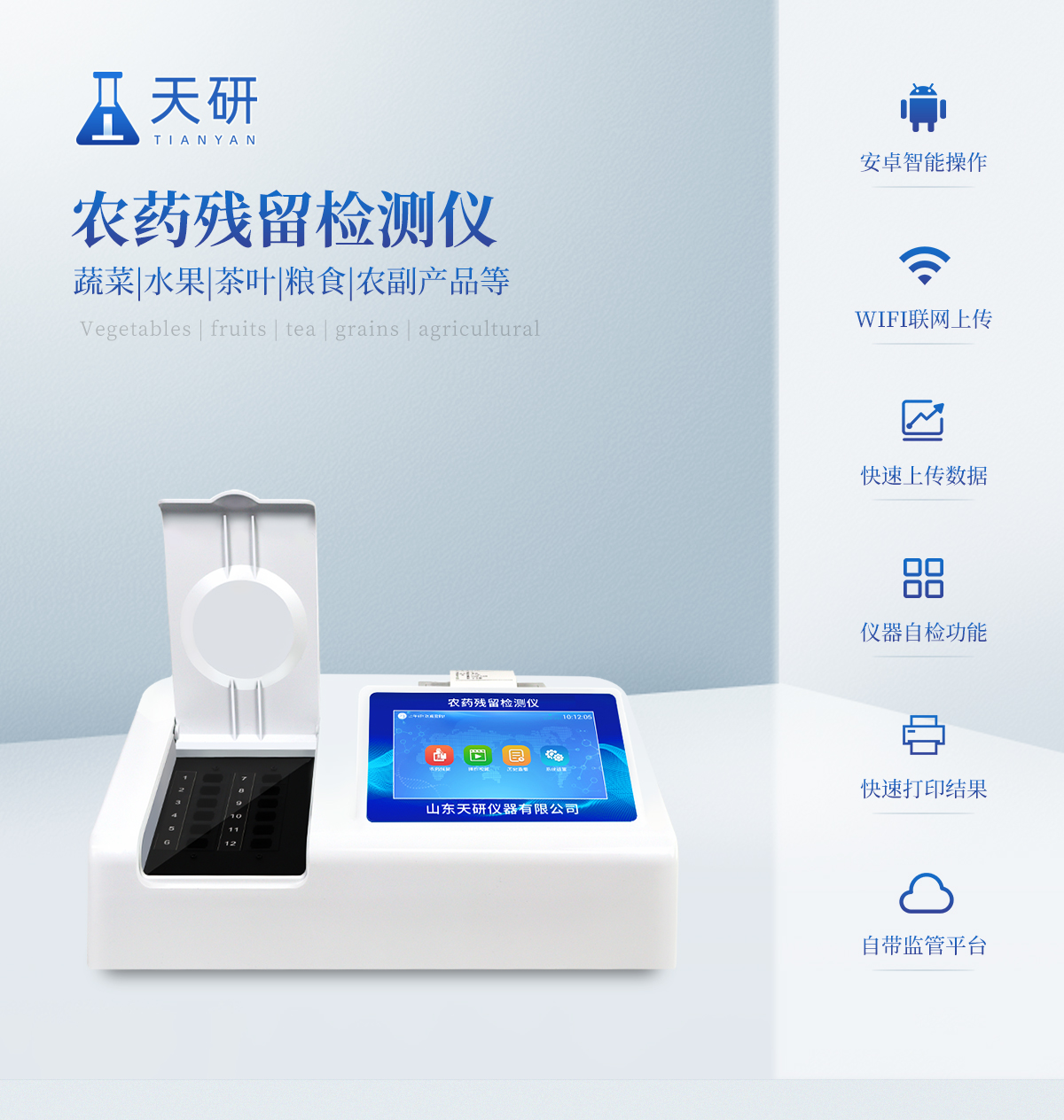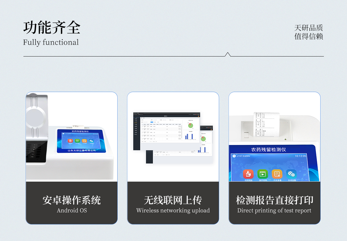 | 乙酰膽堿酯酶和丁酰膽堿酯酶試劑均可以使用,符合國家標(biāo)準(zhǔn)和農(nóng)業(yè)部標(biāo)準(zhǔn)的要求。 | 自動判斷樣品是否合格,檢測結(jié)果更加直觀。 | 儀器具有100多種蔬菜名稱菜單庫,分類管理,并可按需添加或刪除蔬菜名,編輯蔬菜名稱,可直接打印出蔬菜名稱。 | 檢測通道:12個檢測通道,可以同時測試多個樣品,循環(huán)檢測,即放即檢,每個樣品由程序控制分別獨立工作,不會互相干擾。 | 智能操作系統(tǒng),采用更加人性化操作,主控采用多核處理器,主頻1.88Ghz,運轉(zhuǎn)速度更快速,穩(wěn)定性更強。 | 顯示方式:7英寸高靈敏真彩觸摸屏顯示,人性化中文操作界面,讀數(shù)直觀、簡單。 | 打印機采用串口5v打印,可選擇手動打印或者自動打印,三分鐘出打印結(jié)果,打印格式為檢測人姓名、吸光度差值、檢測時間、檢測機構(gòu)、樣品名稱及結(jié)果判定。 | 光源采用進口超高亮發(fā)光二極管,具有低功耗、高精度、穩(wěn)定性強、光源可控可以關(guān)掉不使用的光源,響應(yīng)速度快等優(yōu)點。 | 智能恒流穩(wěn)壓,光強自動校準(zhǔn),長時間連續(xù)工作光源無溫漂現(xiàn)象。 | 儀器具有GPRS遠傳功能,可插手機卡實現(xiàn)數(shù)據(jù)遠傳平臺,wifi聯(lián)網(wǎng)功能,可將數(shù)據(jù)快速上傳電腦,進行數(shù)據(jù)管理與統(tǒng)計。 | 采用USB2.0接口設(shè)計,方便數(shù)據(jù)的存貯和移動,并可隨時與計算機直接相連,并且可用計算機控制儀器。實現(xiàn)數(shù)據(jù)查詢、瀏覽、分析、統(tǒng)計、打印等。 | 智能化程度高,儀器具有自檢功能:具有開機自檢和調(diào)零功能,具有自動檢測重復(fù)性功能 | 儀器具有自身保護功能,可設(shè)置用戶名及密碼,防止非工作人員操作等。 | 采用DC12v直流供電,安全系統(tǒng)更高,并且配備6A鋰電池充電器。 | 儀器具有重新校準(zhǔn)、鎖定、恢復(fù)出廠設(shè)置功能。 |