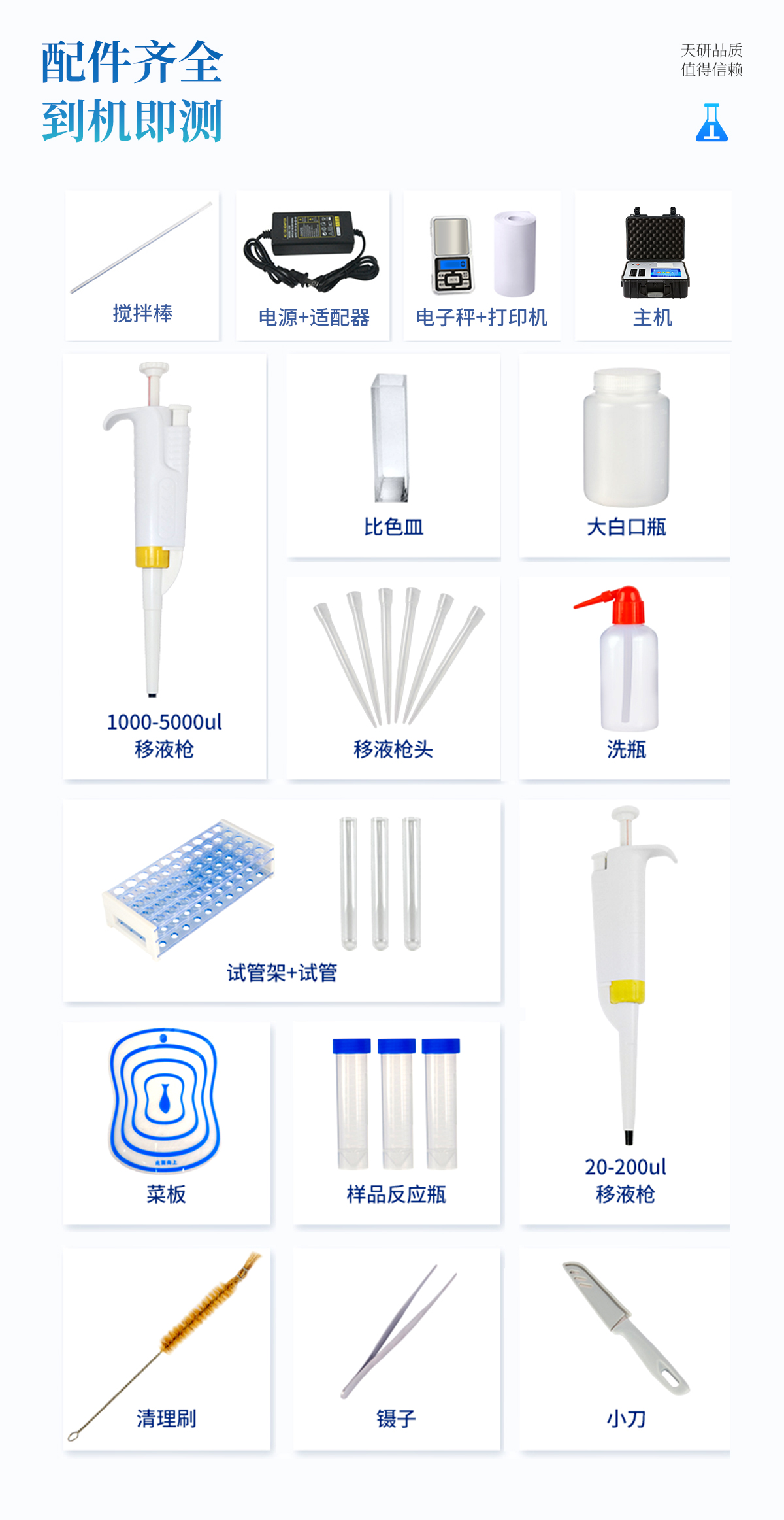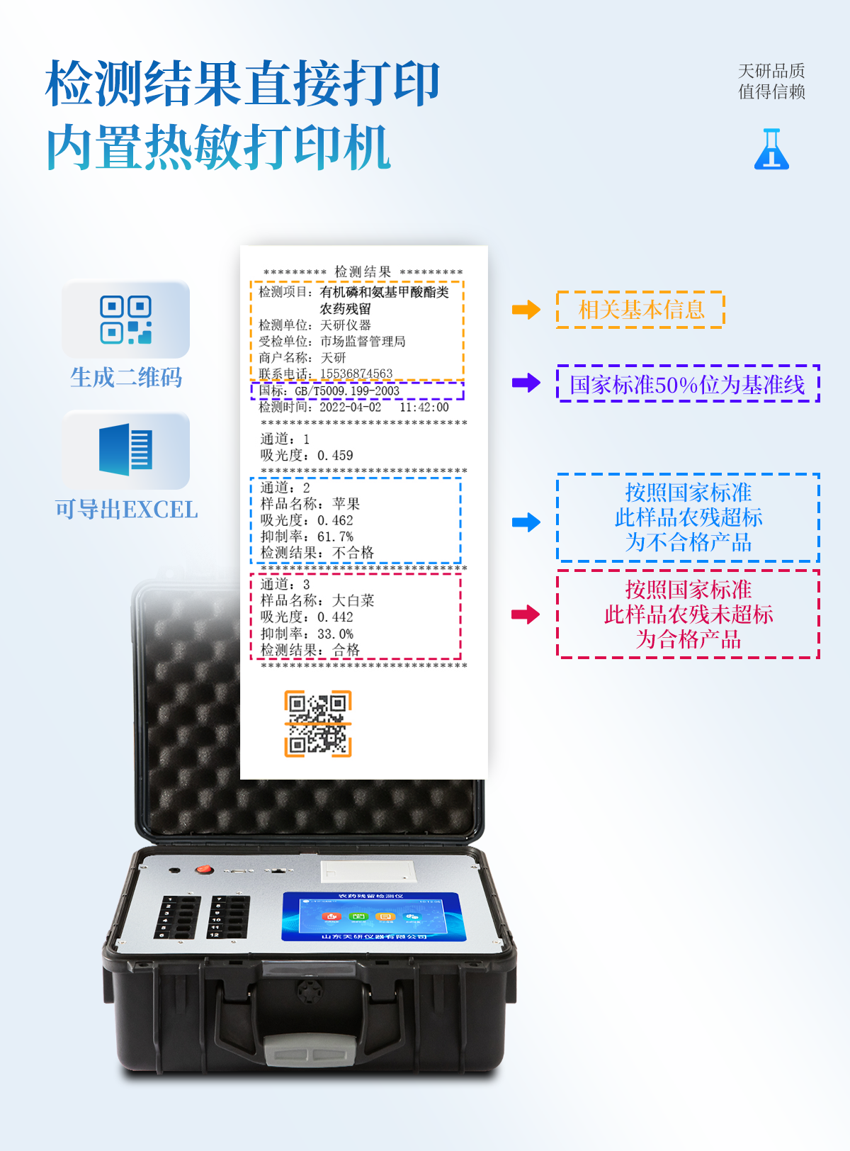 | 機箱采用工業(yè)級ABS工程塑料箱,方便攜帶,穩(wěn)固耐用,便于流動測試。 | 智能操作系統(tǒng),采用更加人性化操作,主控采用多核處理器,主頻1.88Ghz,運轉(zhuǎn)速度更快速,穩(wěn)定性更強。 | 自動判斷樣品是否合格,檢測結(jié)果更加直觀。 | 儀器具有100多種蔬菜名稱菜單庫,分類管理,并可按需添加或刪除蔬菜名,編輯蔬菜名稱,可直接打印出蔬菜名稱。 | 檢測通道:6個檢測通道,可以同時測試多個樣品,循環(huán)檢測,即放即檢,每個樣品由程序控制分別獨立工作,不會互相干擾。 | 儀器具有wifi聯(lián)網(wǎng)功能,可將數(shù)據(jù)快速上傳電腦,進行數(shù)據(jù)管理與統(tǒng)計,4G信號GPRS遠傳功能,可插手機卡實現(xiàn)數(shù)據(jù)遠傳平臺,。 | 顯示方式:7英寸高靈敏真彩觸摸屏顯示,人性化中文操作界面,讀數(shù)直觀、簡單。 | 打印機采用串口5v打印,可選擇手動打印或者自動打印,三分鐘出打印結(jié)果,打印格式為檢測人姓名、吸光度差值、檢測時間、檢測機構(gòu)、樣品名稱及結(jié)果判定。 | 光源采用進口超高亮發(fā)光二極管,具有低功耗、高精度、穩(wěn)定性強、光源可控可以關(guān)掉不使用的光源,響應(yīng)速度快等優(yōu)點。 | 智能恒流穩(wěn)壓,光強自動校準,長時間連續(xù)工作光源無溫漂現(xiàn)象。 | 采用USB2.0接口設(shè)計,方便數(shù)據(jù)的存貯和移動,并可隨時與計算機直接相連,并且可用計算機控制儀器。實現(xiàn)數(shù)據(jù)查詢、瀏覽、分析、統(tǒng)計、打印等。 | 智能化程度高,儀器具有自檢功能:具有開機自檢和調(diào)零功能,具有自動檢測重復性功能 | 儀器具有自身保護功能,可設(shè)置用戶名及密碼,防止非工作人員操作等。 | 采用DC12v直流供電,安全系統(tǒng)更高,并且配備6A鋰電池充電器。 | 儀器具有重新校準、鎖定、恢復出廠設(shè)置功能。 |