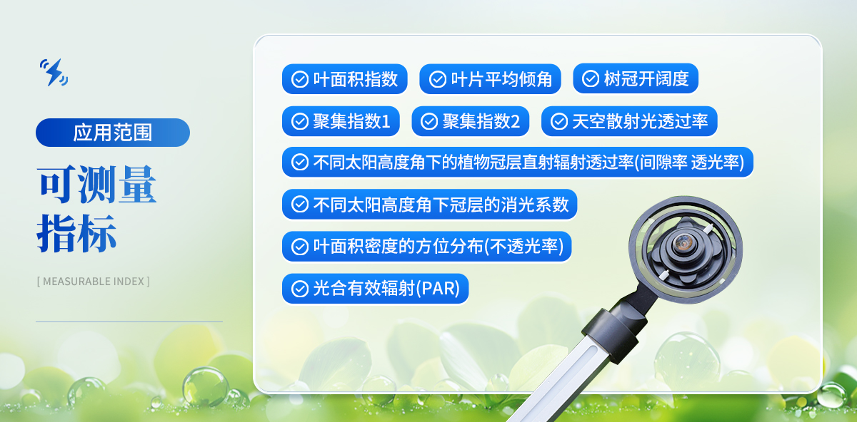 | 魚眼鏡頭可自動(dòng)保持水平狀態(tài):專門為植物冠層結(jié)構(gòu)測量設(shè)計(jì)的小型魚眼攝像鏡頭安裝在手持式萬向平衡接頭上,可自動(dòng)保持鏡頭處于水平狀態(tài),無需三角架; | 魚眼鏡頭可以伸入至冠層中:鏡頭安裝在搖臂一端,由于小巧和帶有測量桿,可以方便地水平向前或垂直向上伸入到冠層不同高度處,快速地進(jìn)行分層測量,測出群體內(nèi)光透過率和葉面積指數(shù)垂直分布圖; | 圖像分析軟件:圖像分析軟件可以任意定義圖像分析區(qū)域(天頂角可分10區(qū),方位角可分10區(qū))。 | 可屏蔽不合理冠層部分:對不同方向的冠層進(jìn)行區(qū)域性分析時(shí),可以任意屏蔽地物景象和不合理的冠層部分(如缺株、邊行問題等)。對不同天頂角起始角和終止角的選擇,可以避開不符合計(jì)算該冠層結(jié)構(gòu)參數(shù)的冠層孔隙條件,通過手動(dòng)調(diào)節(jié)閾值,可以更精準(zhǔn)的測量出葉面積指數(shù)等參數(shù); | 可測量指標(biāo) | 葉面積指數(shù) | 葉片平均傾角 | 天空散射光透過率 | 不同太陽高度角下的植物冠層直射輻射透過率 | 不同太陽高度角下冠層的消光系數(shù) | 葉面積密度的方位分布 |