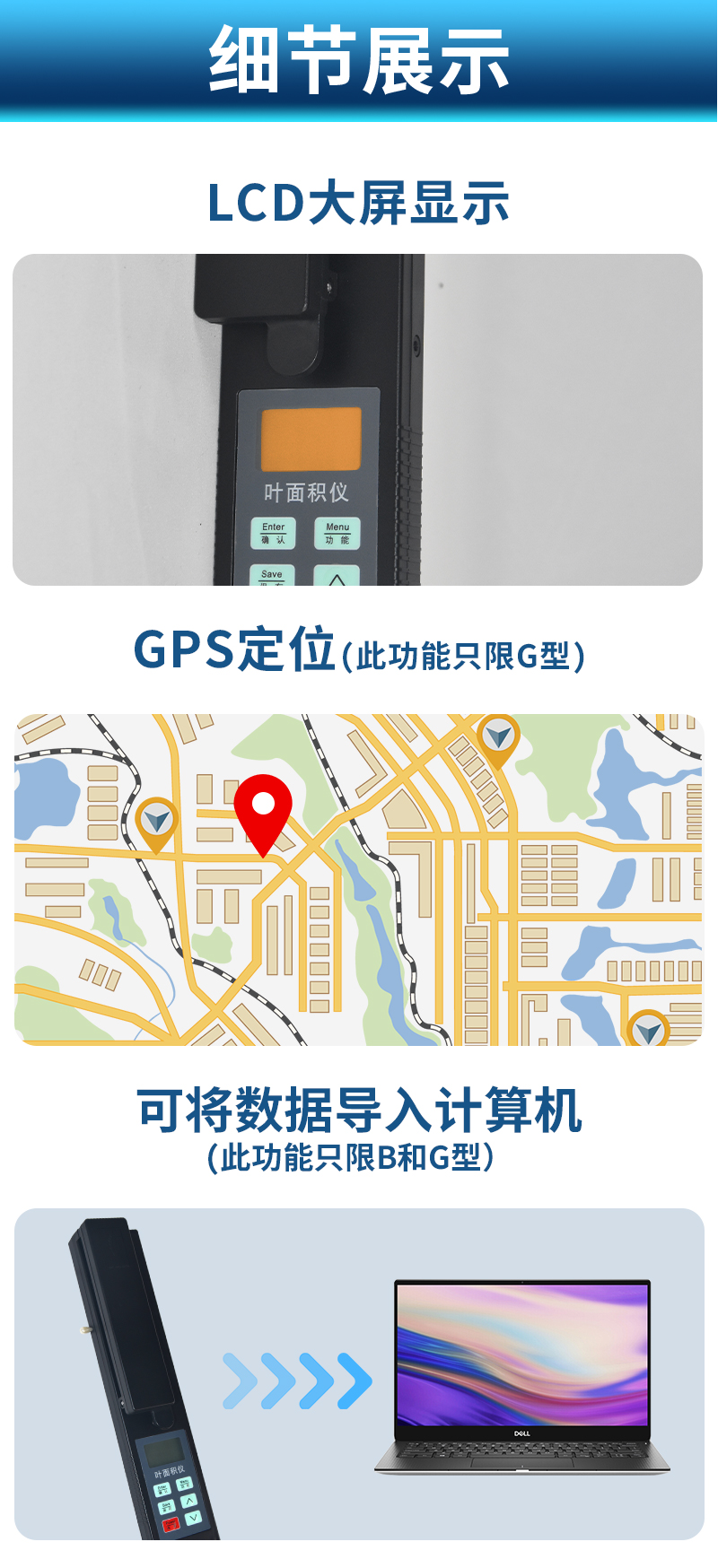 | 1)主機、探頭一體化設計,更方便操作。 | 2)采用微電腦技術,LCD大液晶顯示。 | 3)高性能電池,無需外部供電,低電壓顯示,更適用于野外測量。 | 4)一次性可測量較大葉片面積(1000*155mm2) | 5)可存儲250組數(shù)據(jù)(葉面積、葉長、葉寬)。 | 6)可測量葉片的多種參數(shù):葉面積、平均葉面積、葉長、葉寬。 | 7)通訊接口:RSR232接口,可將數(shù)據(jù)導入計算機。(此功能只限B和G型) | 8)GPS定位:集成高速GPS定位模塊,上傳數(shù)據(jù)都自帶時間、經(jīng)緯度信息,方便更有效的 |