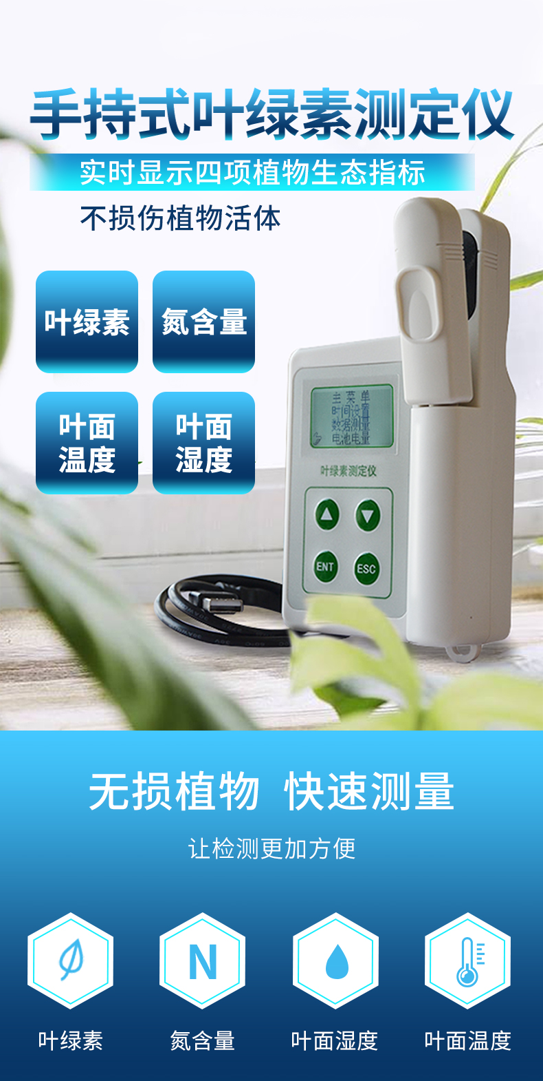 氮素含量一般情況下直接反應(yīng)作物的健康情況,生長(zhǎng)狀態(tài)、了解植物真實(shí)的硝基需求量和土壤硝基的缺乏程度或是否過多地施加了氮肥,廣泛應(yīng)用于氮肥管理,除草劑應(yīng)用,葉片衰老,環(huán)境脅迫等研究,葉綠素測(cè)量?jī)x在農(nóng)業(yè)種植過程中有很大的意義。 葉 綠素含量的測(cè)定結(jié)果是SPAD值,是葉片在兩種波長(zhǎng)650nm 和940nm,葉片傳輸光的數(shù)量進(jìn)行比值計(jì)算,來確定葉片當(dāng)前葉綠素的相對(duì)數(shù)量(兩種波長(zhǎng)范圍內(nèi)的透光系數(shù)來確定葉片當(dāng)前葉綠素的相對(duì)數(shù)量 ),SPAD值與葉綠素之間成正比關(guān)系,因此SPAD值往往間接地可代表葉綠素值,從而可以評(píng)估植物健康狀況、生長(zhǎng)狀態(tài),因而在農(nóng)業(yè)中,時(shí)常使用葉綠素計(jì) 來進(jìn)行對(duì)植物葉綠素含量進(jìn)行檢測(cè),以此來進(jìn)行指導(dǎo)氮肥的施用量,因而在農(nóng)業(yè)種植過程中使用葉綠素計(jì)來進(jìn)行指導(dǎo)氮元素含量的施肥,同時(shí)在很多植物中,以此來 進(jìn)行判斷植物的抗逆性。 葉溫常用來表示植物的體溫狀況,植物葉片中所有的化學(xué)反應(yīng),都受葉片溫度的影響,在植物生理活動(dòng)的分析中經(jīng)常用到。葉溫與 氣溫的差值,可以表明植物的缺水情況或受旱程度。因?yàn)楫?dāng)水分供應(yīng)充足時(shí),植物蒸騰正常,蒸騰耗熱可以降低植物體溫,這時(shí)葉溫比氣溫低;反之受旱時(shí),植物體 溫上升,可高于當(dāng)時(shí)的氣溫。