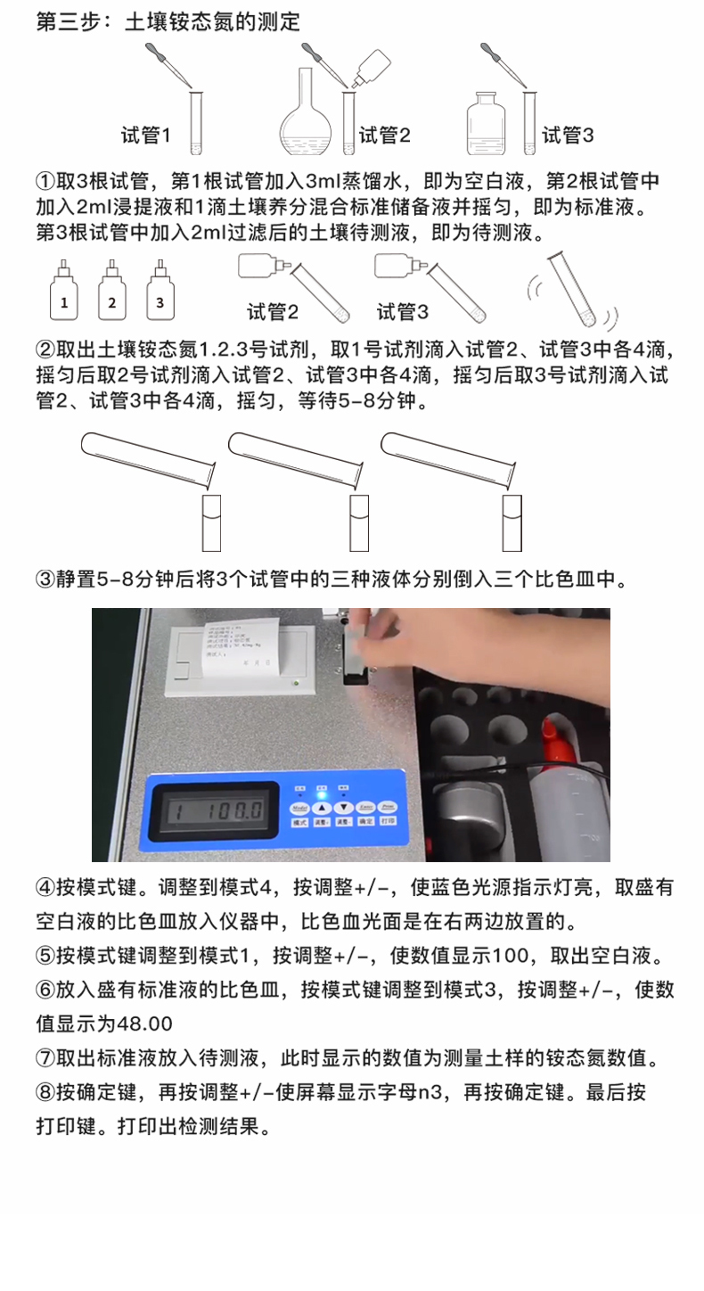 | 1.電源:交流 220±22V 直流 12V+5V(可用車載電源也可選擇儀器內(nèi)置鋰電池) | 2.功率: ≤5W | 3.量程及分辨率:0.001-9999 | 4.重復(fù)性誤差: ≤0.3%(0.003,重鉻酸鉀溶液) | 5.儀器穩(wěn)定性:三分鐘內(nèi)漂移小于0.2%(0.002,透光度測(cè)量)。儀器開機(jī)預(yù)熱5分鐘后,兩分鐘內(nèi)顯示數(shù)字無漂移(透光度測(cè)量),五分鐘內(nèi)數(shù)字漂移不超過0.3%(透光度測(cè)量);二十分鐘內(nèi)數(shù)字漂移不超過0.5%(透光度測(cè)量)、0.001(吸光度測(cè)量);三十分鐘內(nèi)數(shù)字漂移不超過0.7%(透光度測(cè)量)、0.002(吸光度測(cè)量)。 | 6.線性誤差: ≤1%(0.01,硫酸銅檢測(cè)) | 7.靈敏度:紅光≥4.5 ×10-5 藍(lán)光≥3.17×10-3 綠光≥2.35×10-3 橙光≥2.13×10-3 | 8.波長(zhǎng)范圍 :紅光:680±2nm; 藍(lán)光:420±2nm;綠光:510±2nm;橙光:590±4nm | 9.PH值(酸堿度): (1)測(cè)試范圍:1~14 (2)精度:0.1 (3)誤差:±0.1(擴(kuò)展) | 10.鹽量(電導(dǎo)):(1)測(cè)試范圍:0.01%~1.00% (2)相對(duì)誤差:±5%(擴(kuò)展) | 11.土壤水分技術(shù)參數(shù)水分單位:﹪(g/100g);含水率測(cè)試范圍:0-100﹪;誤差小于0.5% | 12.土壤中速效N、P、K三種養(yǎng)分一次性同時(shí)浸提測(cè)定、科學(xué)指導(dǎo)施肥量 | 13.肥料中氮(N)、磷(P)、鉀(K)等養(yǎng)分同時(shí)、快速、準(zhǔn)確檢測(cè) | 14.測(cè)試速度:測(cè)一個(gè)土樣(N、P、K)≤30分鐘(含前處理時(shí)間,不需用戶提供任何附件) | 15.同時(shí)測(cè)8個(gè)土樣≤1小時(shí)(含前處理時(shí)間) | 16.數(shù)據(jù)查詢打印:測(cè)試數(shù)據(jù)可存儲(chǔ)、查詢、打印,內(nèi)置新型一鍵式熱敏打印機(jī) |
