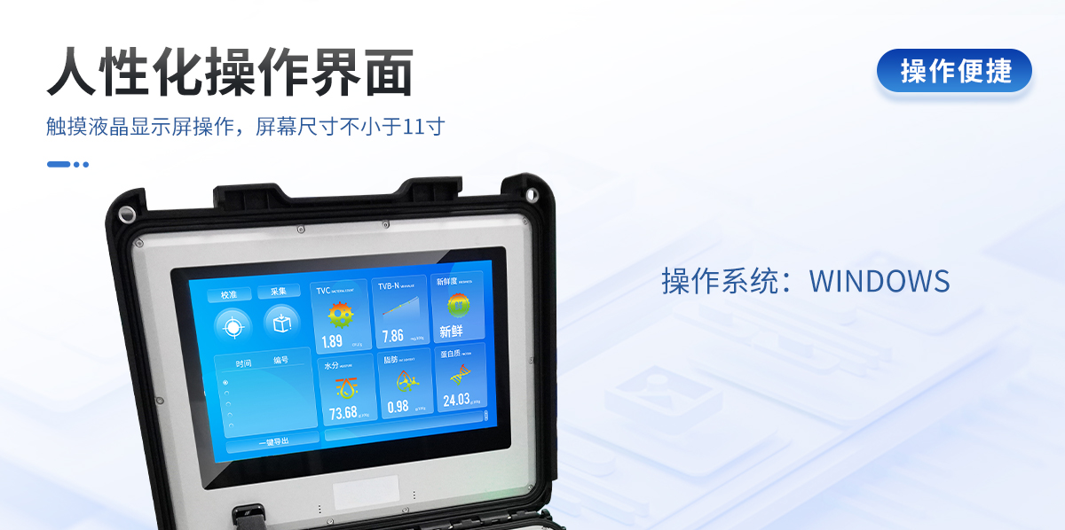 可用于檢測生鮮肉的蛋白質(zhì)、脂肪、水分、pH、TVC、TVB-N、新鮮度、L*、A*、B*等品質(zhì)參數(shù)。配備手提箱式防水減震外殼、大尺寸觸控屏幕并內(nèi)置大容量電池,可一鍵自動校準,是一款適合移動作業(yè)場景的高精度生鮮肉品質(zhì)檢測儀,其可用于生鮮肉及肉品生產(chǎn)、加工、儲運企業(yè)、肉品品質(zhì)監(jiān)管部門等。