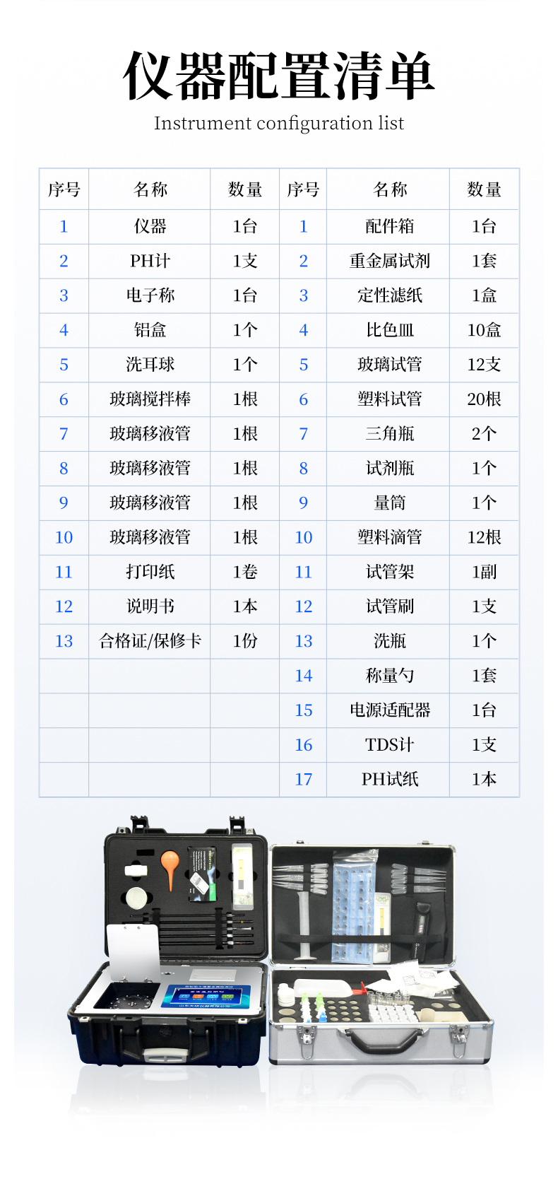 | 名稱(chēng) | 配件箱 | 重金屬試劑 | 定性濾紙 | 比色皿 | 玻璃試管 | 塑料試管 | 三角瓶 | 試劑瓶 | 量筒 | 塑料滴管 | 試管架 | 試管刷 | 洗瓶 | 稱(chēng)量勺 | 電源適配器 | TDS計(jì) | PH試紙 |