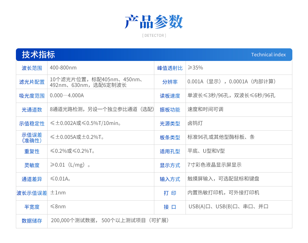 產(chǎn)品特點(diǎn):1. 內(nèi)置嵌入式系統(tǒng),無需外接電腦即可操作、存儲(chǔ)、打印。2. 全屏顯示96孔整板數(shù)據(jù), 直觀的可視化布板操作界面。3. 便捷的觸摸屏輸入,另可選配外接鼠標(biāo)和鍵盤。4. 測(cè)量模式:?jiǎn)尾ㄩL(zhǎng)檢測(cè),雙波長(zhǎng)檢測(cè),兩點(diǎn)法,動(dòng)力學(xué)法,酶抑制率,終點(diǎn)法、速率法。5. 可選擇吸光度、Cut-Off定性計(jì)算、單點(diǎn)定標(biāo)、折線回歸、線性回