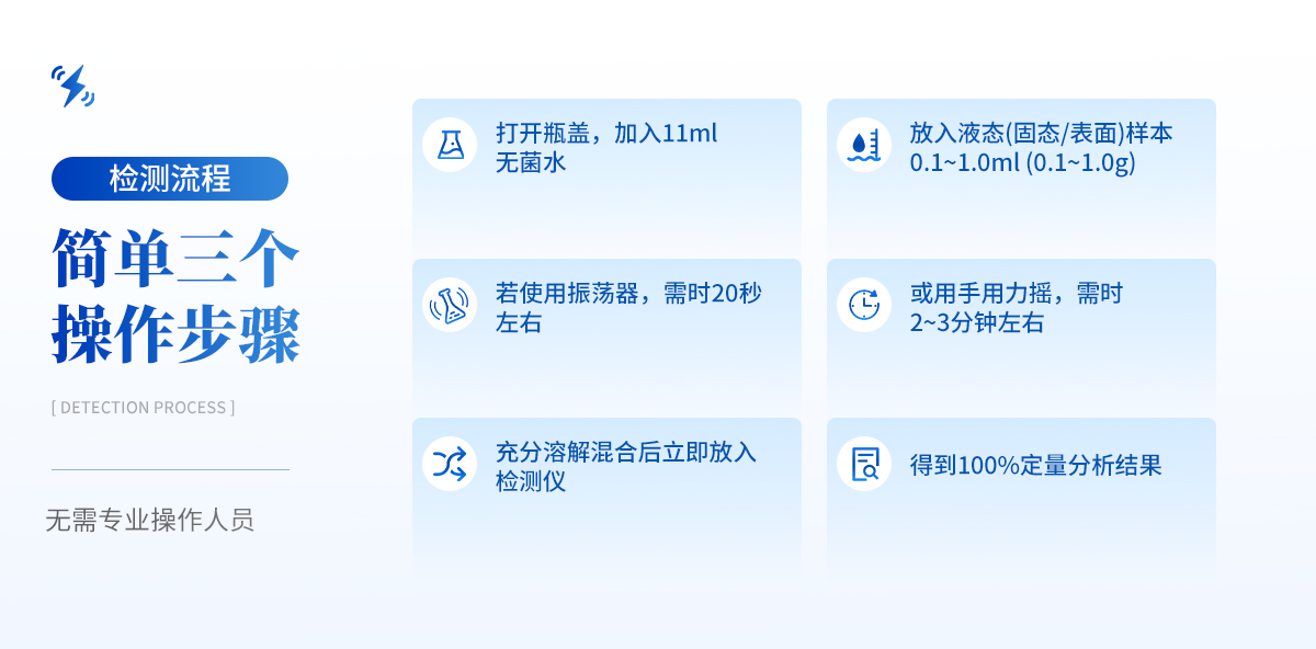 | 1) 可檢測(cè)固態(tài)、液態(tài)、表面、膏狀、漿狀樣本 | 2) 樣本在檢測(cè)時(shí)無需任何的前處理過程,直接丟入檢測(cè)瓶即可 | 3) 可自動(dòng)控制孵育溫度和孵育時(shí)間 | 4) 檢測(cè)樣本只需1ml/1g;同一溫度下可同時(shí)檢測(cè)8個(gè)樣品 | 5) 靈敏度高達(dá)可檢測(cè)到1目標(biāo)微生物;特異性高達(dá)99.999% | 6) 獨(dú)立、持續(xù)的檢測(cè)并記錄瓶中的微生物數(shù)量(CFU) | 7) 簡(jiǎn)單三個(gè)操作步驟,傻瓜型,無需專業(yè)操作人員 | 8) 儀器便攜式,可隨時(shí)隨地進(jìn)行檢測(cè)、100%定量分析,并可直接連接電腦出定量分析檢測(cè)報(bào)告 |